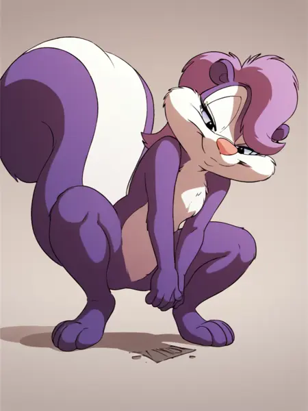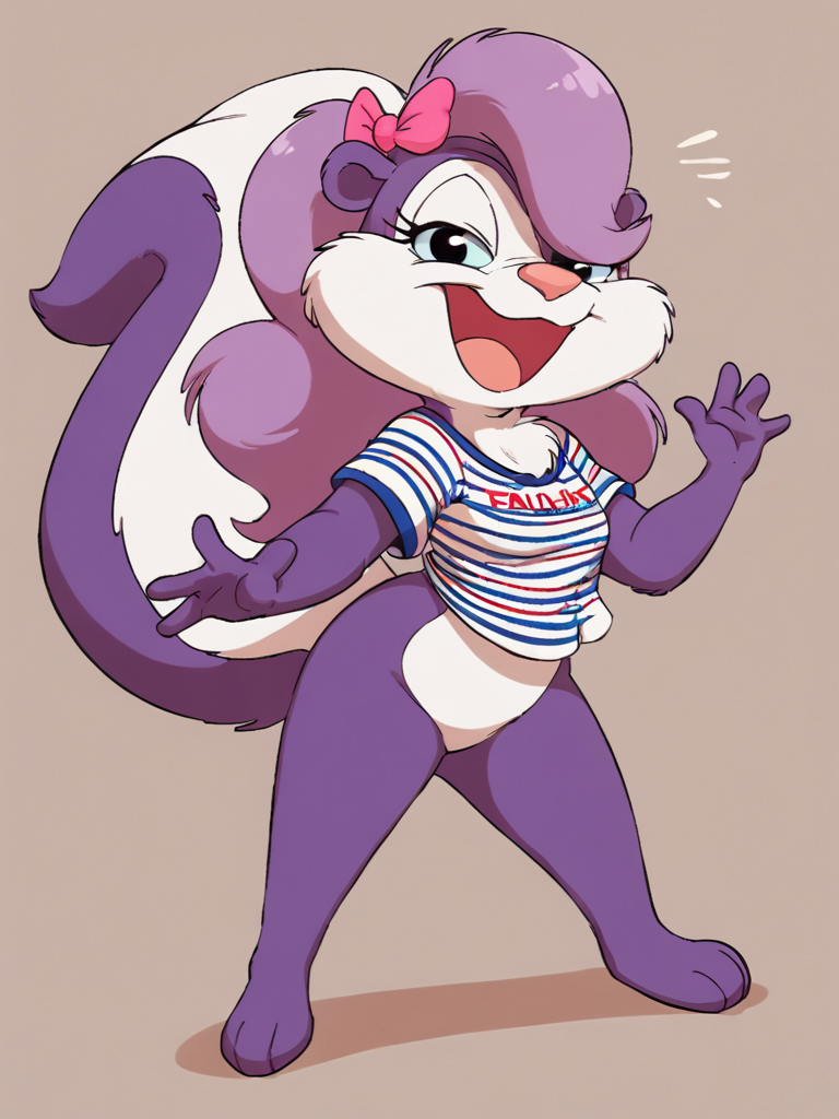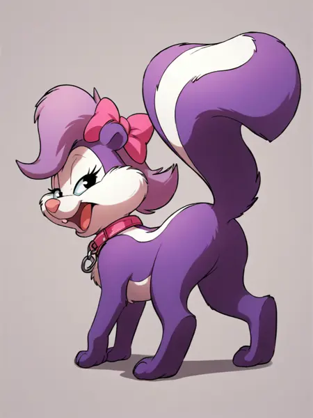 Standard tokens: Fifi, skunk, girl, purple body, purple legs, purple arms, white-purple tail, white cheeks, white eyelids, pink nose, purple bangs, purple hair, pink bow over ear, colorless eyes