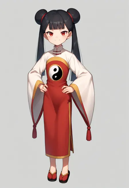 基本プロンプト:1girl, meilingli, black hair, blunt bangs, double bun, twintails, long hair, red eyes
