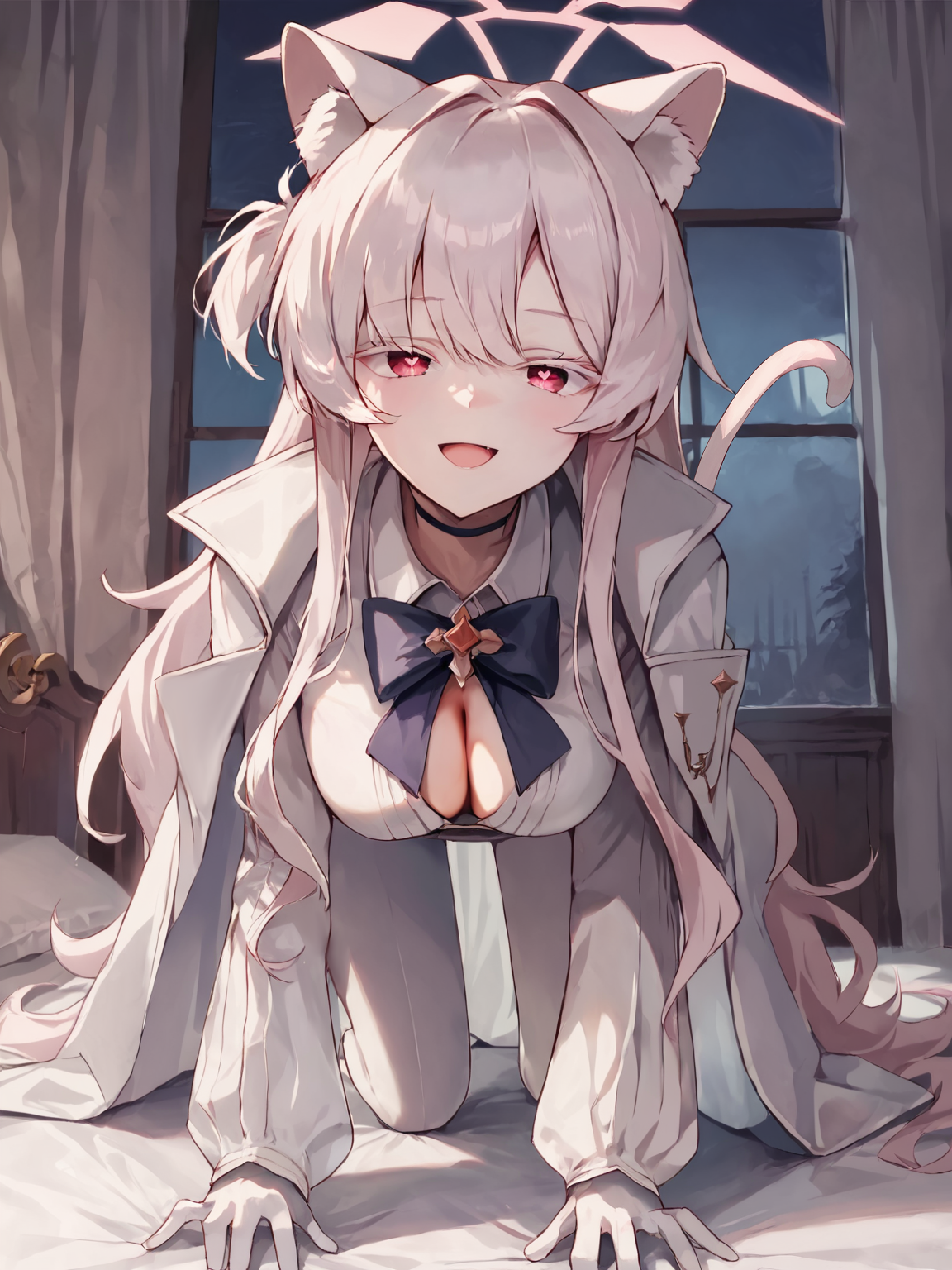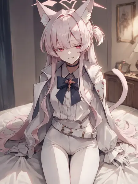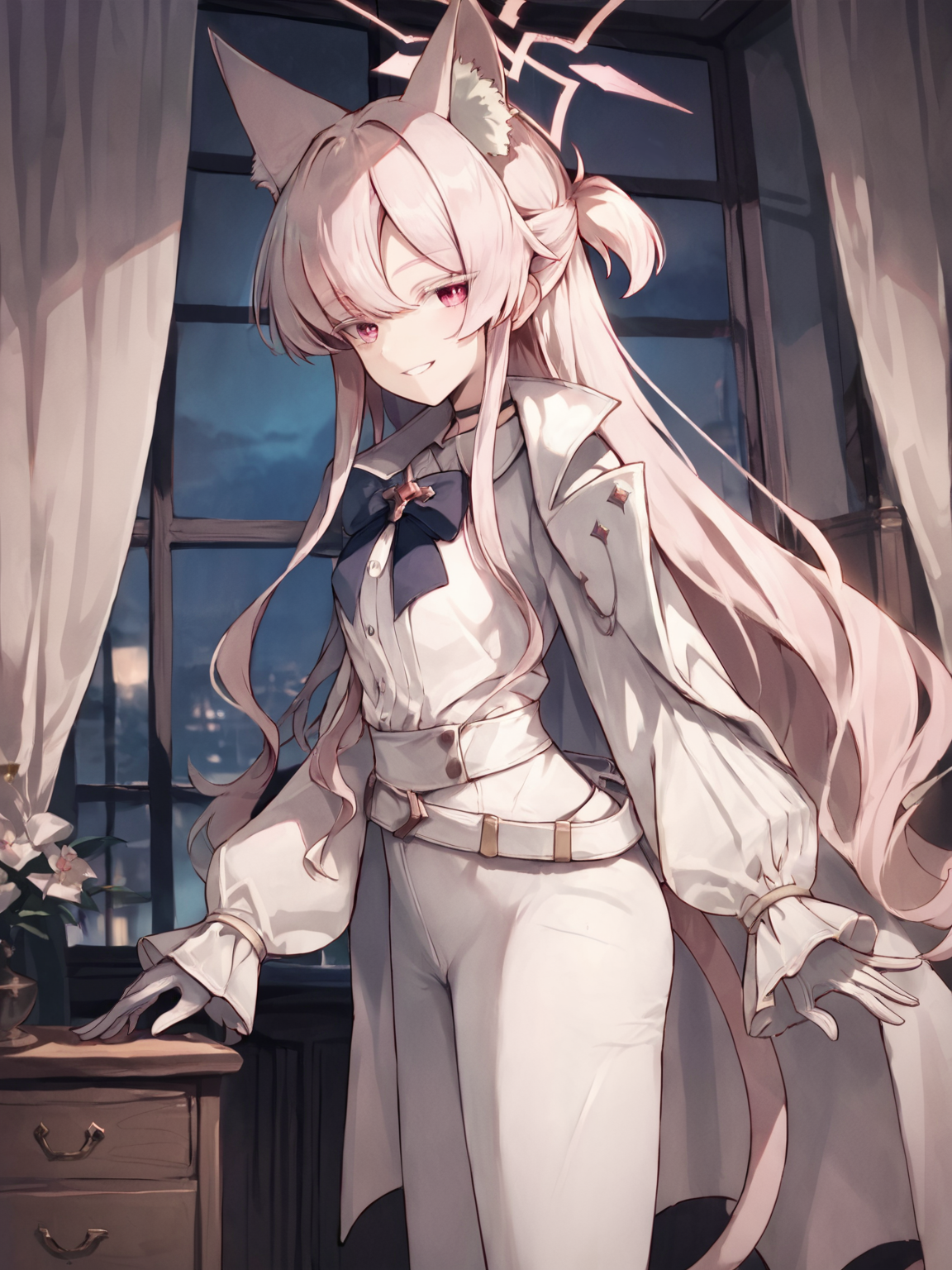 akira, 1girl, animal ears, solo, gloves, long hair,  halo, pants, shirt,  belt, white gloves, animal ear fluff, cat ears, white shirt, pink hair, white pants, bow, long sleeves, bowtie, pink eyes, red eyes, tail, choker, bangs, white cape, white collared shirt, very long hair,