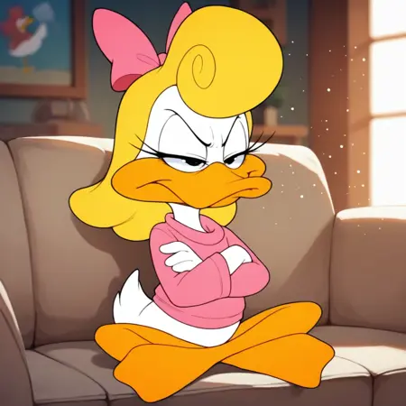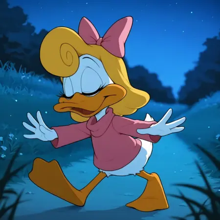 标准标记:Shirley,鸭子,女孩,白色身体,闭着嘴,白色尾巴,白色手,白色腹部,白色眼睑,黄色喙,黄色头发,黄色鸭腿,头上粉色蝴蝶结,黑色眼睛,粉色毛衣