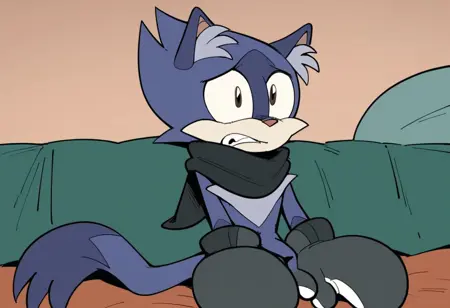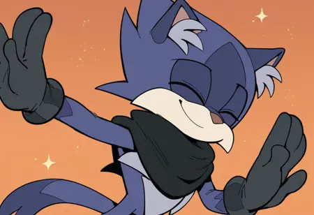 来自《音速小子》IDW漫画的猫Duo。你最好小心点,这只猫并非表面看起来那样。使用 "sonic (series)" 让他更符合音速小子角色的风格,但请将 "sonic the hedgehog" 作为负面提示词添加,否则他会看起来很奇怪。