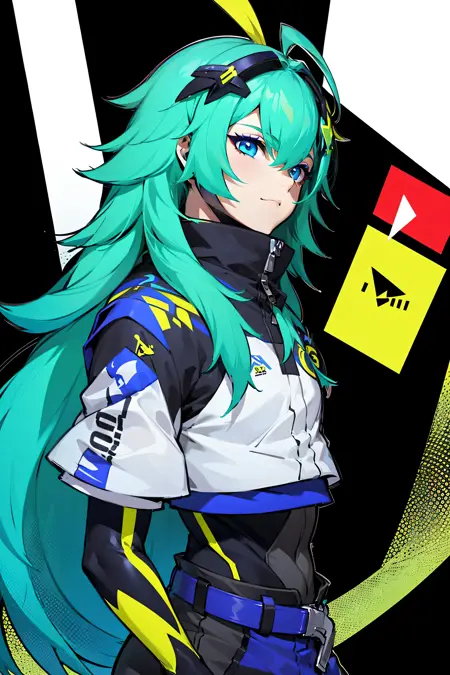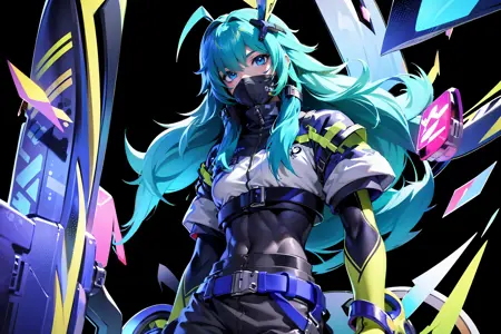 여성: Zata S-Dreamer, (1boy:1.4), 남성 중심, 단독, 긴 머리, 매우 긴 머리, 머리 장식, 초상화, 녹색 머리, 파란색 머리, 청록색 머리, ahoge, 머리 장식, 깃털, 파란 눈, 다색 눈, 아이섀도우, 눈 사이의 머리카락, 메이크업, 입 가린 상태, 마스크, 입 마스크, 검은 마스크, 높은 칼라, 바디수트, 재킷, 단정한 재킷, 셔츠, 바지, 검은 바지, 짧은 소매, 장갑, 검은 장갑, 손톱, 발톱, 벨트, 지퍼, 팬티스타킹, 부츠, 신발, 흰색 운동화, 빛나는, 파워 심볼, 대화 방울, 큐브, 무늬, 네온 트림, 고양이, 단순한 배경