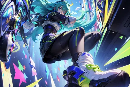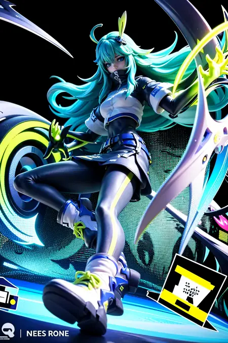 남성: Zata S-Dreamer, (1girl:1.4), 시선을 보는 이에게 향함, 단독, 긴 머리, 매우 긴 머리, 머리 장식, 초상화, 녹색 머리, 파란색 머리, 청록색 머리, ahoge, 머리 장식, 깃털, 파란 눈, 다색 눈, 아이섀도우, 눈 사이의 머리카락, 메이크업, 입 가린 상태, 높은 칼라, 바디수트, 재킷, 단정한 재킷, 셔츠, 가슴, 중간 크기 가슴, 배꼽 가린 상태, 바지, 검은 바지, 짧은 소매, 장갑, 검은 장갑, 손톱, 발톱, 벨트, 지퍼, 팬티스타킹, 부츠, 신발, 흰색 운동화, 빛나는, 파워 심볼, 대화 방울, 큐브, 무늬, 네온 트림, 고양이, 단순한 배경