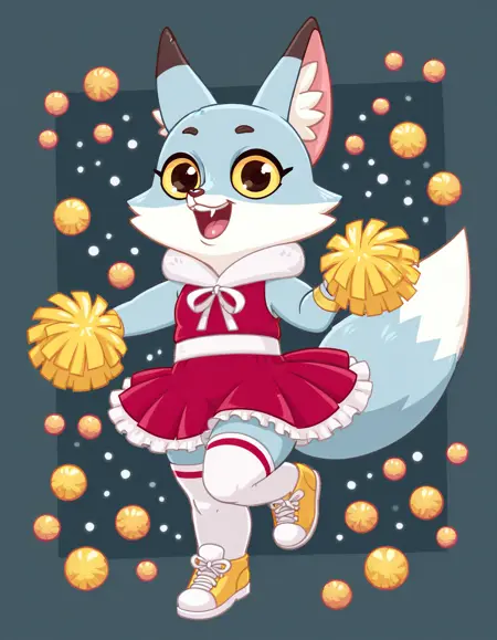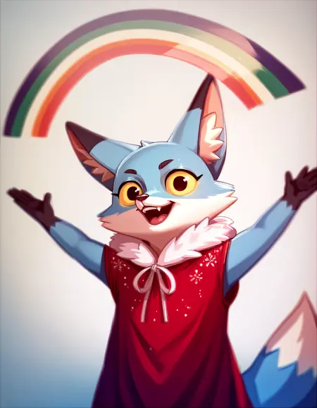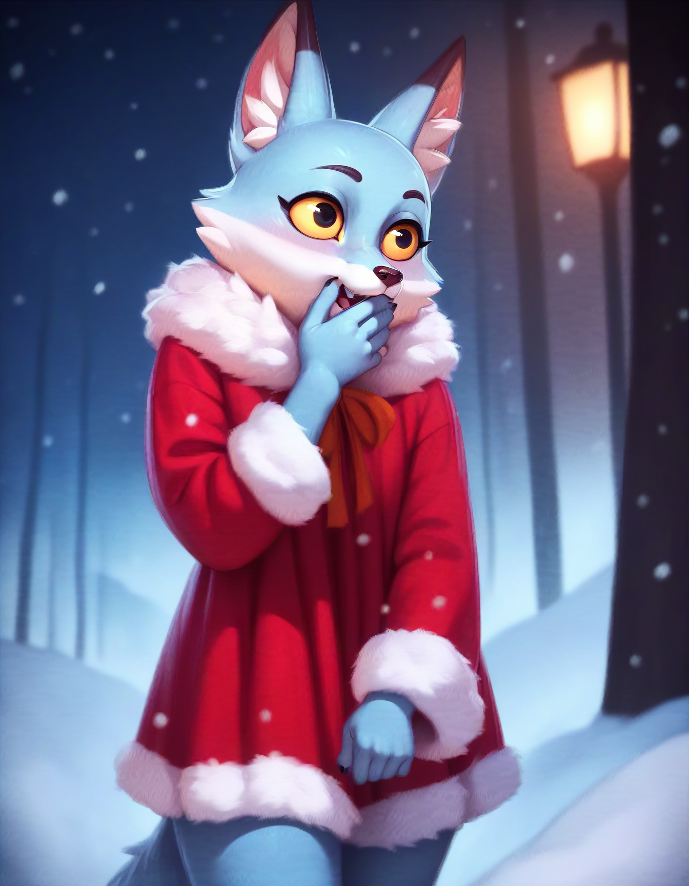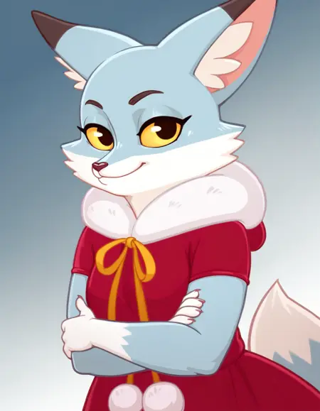Promt: Asya, blue fur, yellow sclera, fox tail, red dress with white fur trim.
