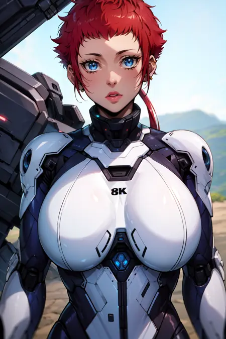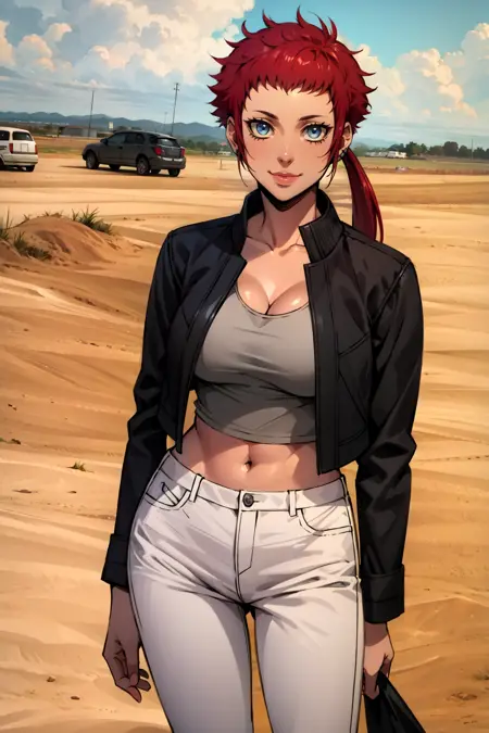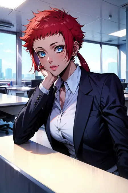 赤髪、短髪、低めのポニーテール、青い目、耳のピアス、ピアス、ピンクの唇
