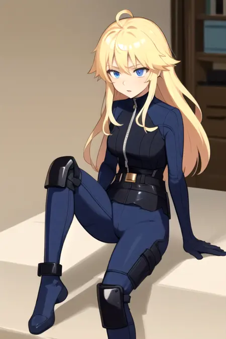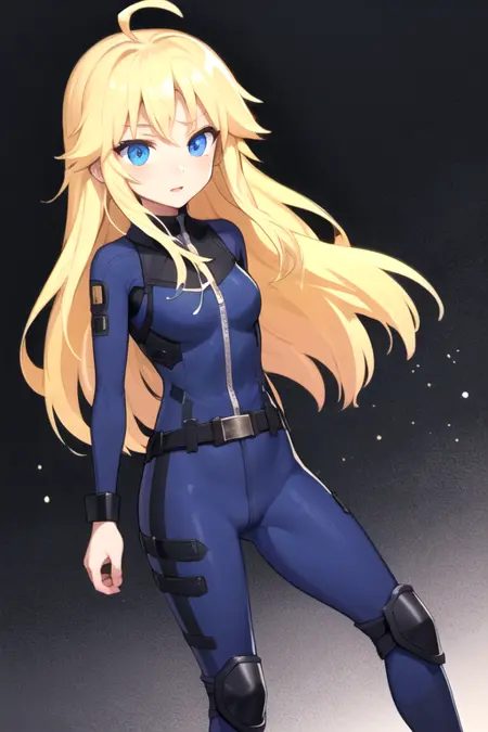 NaomiCPUCS, 1girl, solo, long hair, blue eyes, blonde hair, ahoge, belt, blue bodysuit, knee pads, animification,