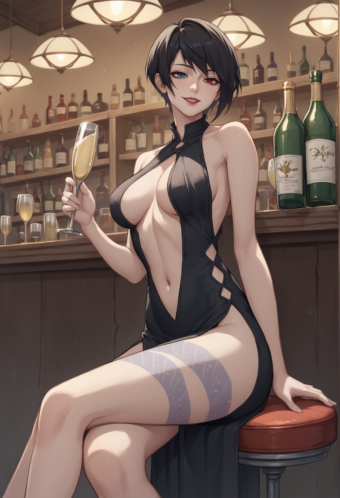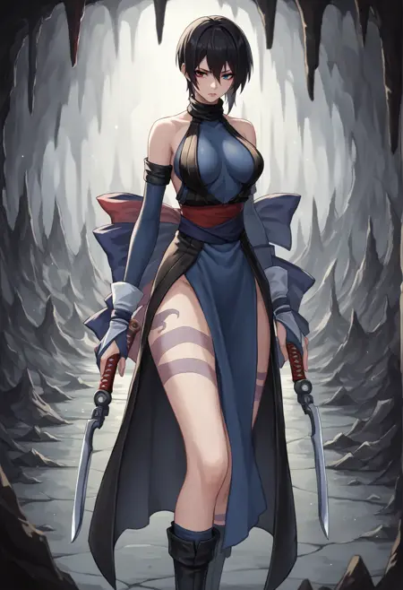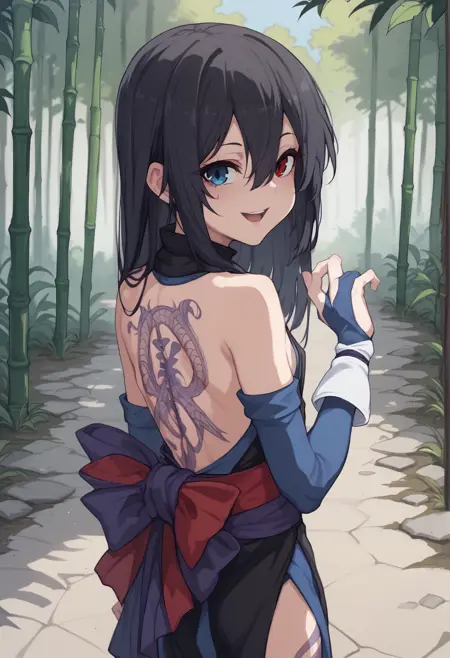 显著标签:短发、黑发、异色瞳、蓝眼、红眼、和服、忍者、腰带、部分露指手套、丝带、靴子、侧乳、腿部纹身、背部纹身