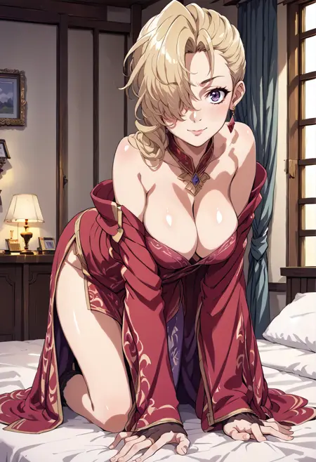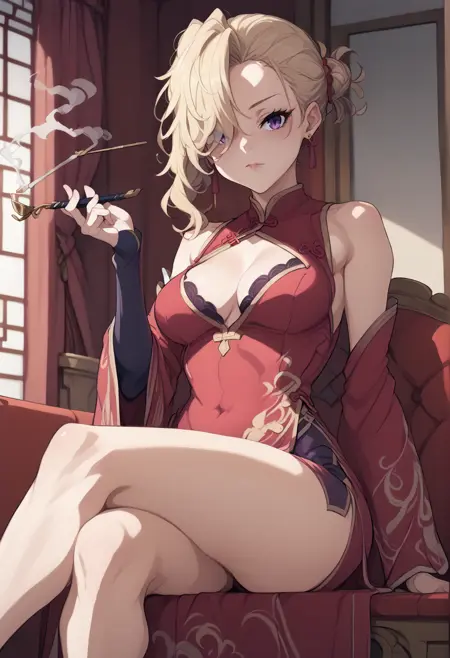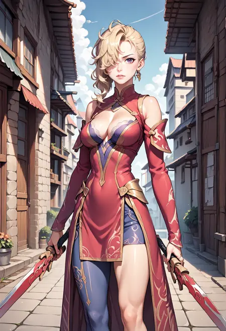 주요 태그: 금발, 파란 눈, 한쪽 눈에 덮인 머리카락, 보석, 귀걸이, 중국식 옷, 가슴 노출, 비대칭 옷, 신부 장갑, 한쪽 허벅지 긴 양말