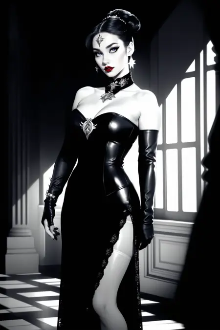 dr3ss, collar, dark lace pencil skirt, leather, black corset, sequins, collar, detached sleeves, fingerless gloves, (metal forehead jewelry circlet), bare shoulders, long braid