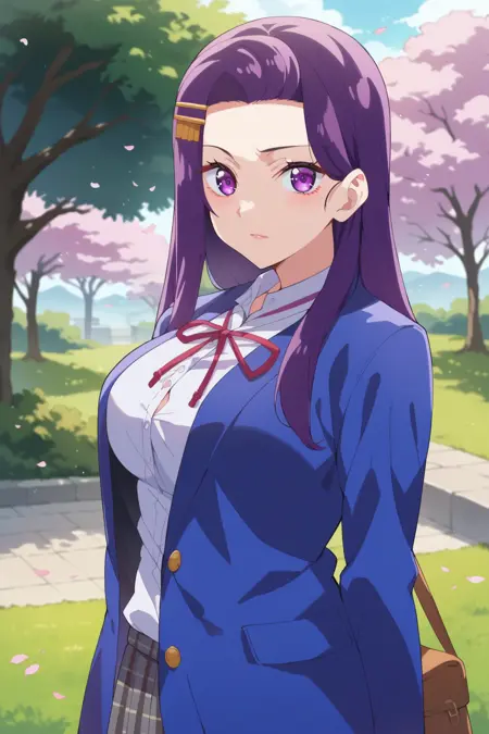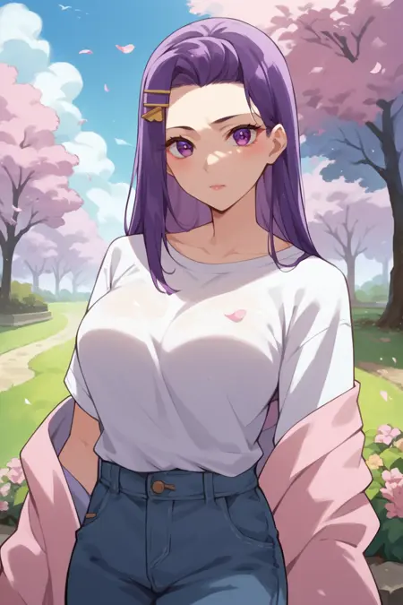 Sayuri_Akino,hairclip,large breasts,long hair,purple eyes,purple hair