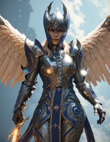 'dameAylin' 是触发标签,然后使用 'armor'、'helmet'、'blonde hair'、'scars'、'open wings'、'closed wings' 来自定义。