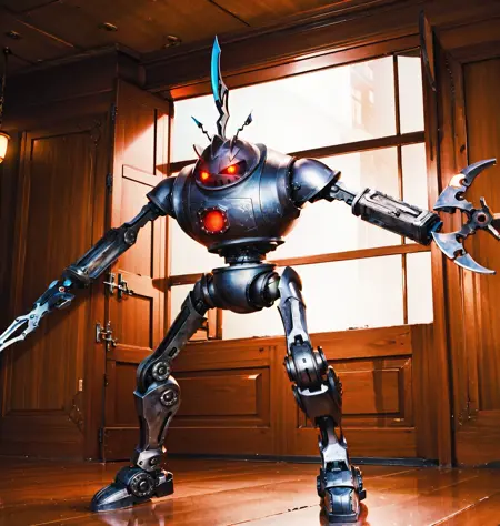 아마 robot(zathura), zathura, humanoid robot, mecha, robot head, glowing eyes, red eyes, mechanical horns, antennae, machine, electricity 등의 프롬프트로(Trigger Word) 이 투박한 로봇의 그림을 생성하실 수 있겠습니다. 제가 나름대로 이 로봇의 영화 속에서의 모습을 최대한 재현하고자 circular saw, booster, jetpack 등의 프롬프트도 넣어봤는데.... 재현이 생각보다 잘 되지 않습니다. 사실 그래서 조금 업로드가 늦어진 측면도 있습니다. 시도해보실 분은 해보시기 바랍니다.