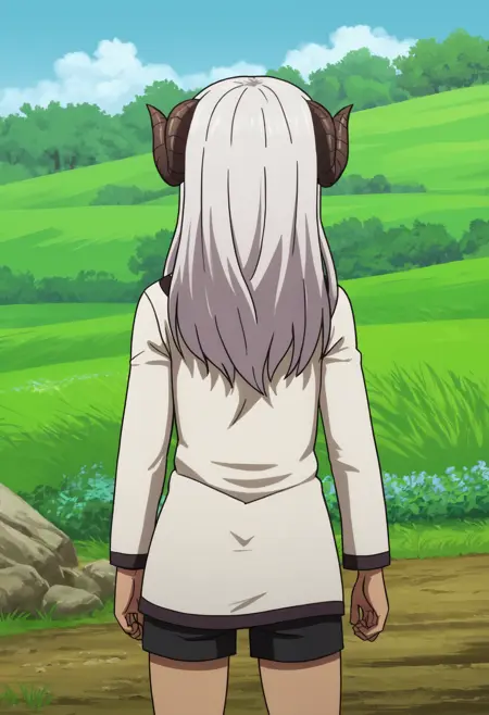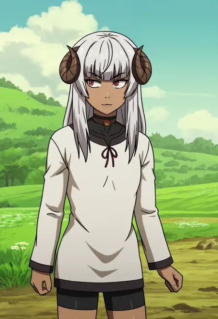 white dress, black shorts, long sleeves, choker for her usual outfit. covered collarbone can help if choker is making the cover disappear.