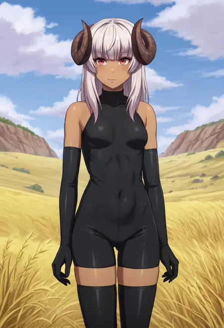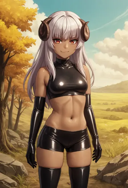 felm, horns, dark-skinned female for the character. small breasts being useful helper tag.