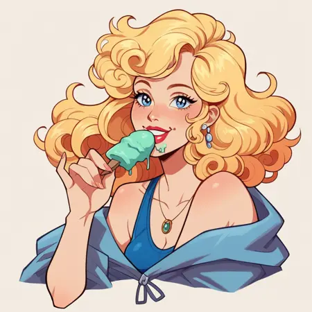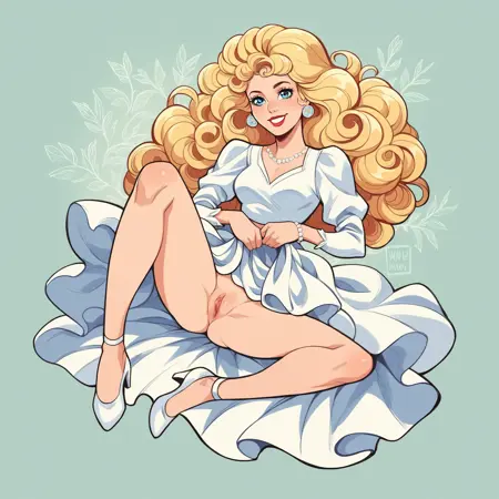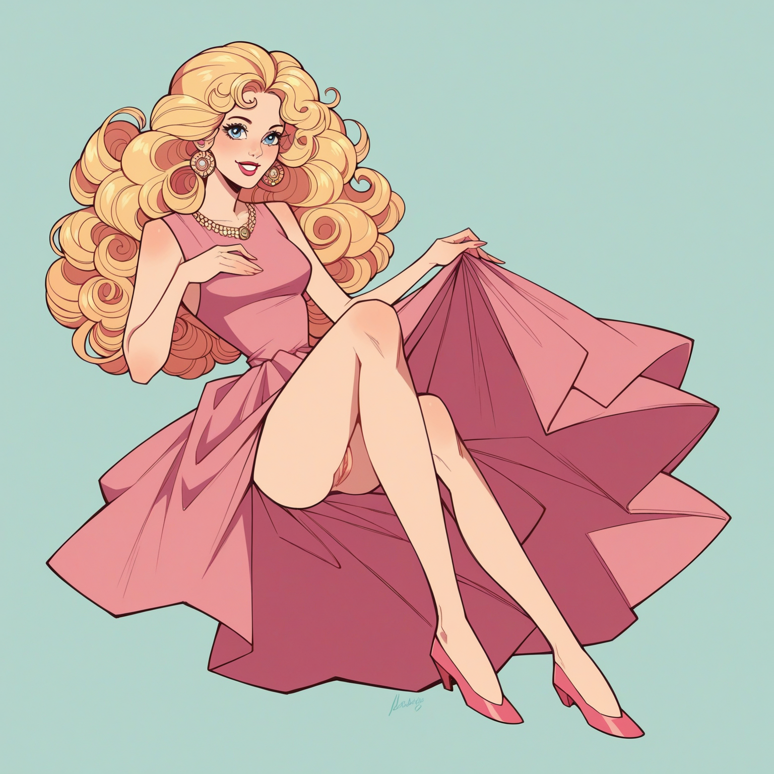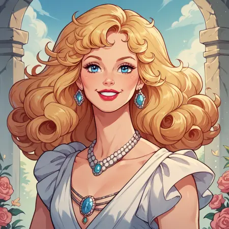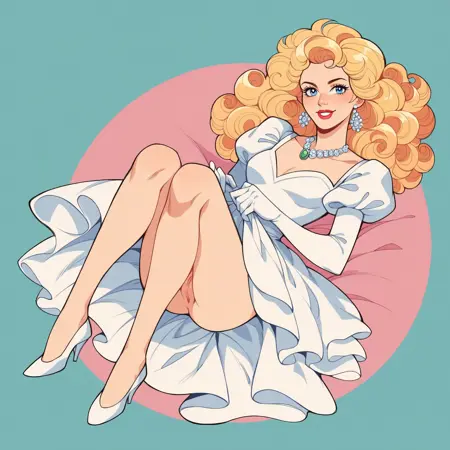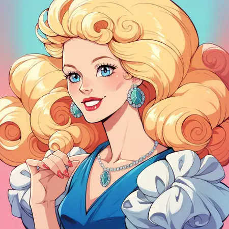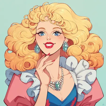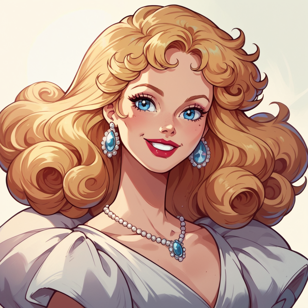 キーワード:hud_millirob, 1girl, 金色のカールヘア, 青い目, シングル, ドレス, ジュエリー, レトロなアートスタイル, 笑顔, リップストック,