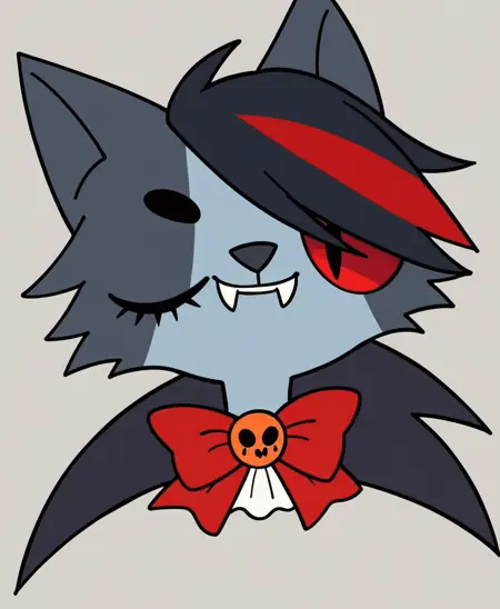 Smokey, red eye, smile, vampire costume,Dracula, Count Dracula,Dracula cat,frill,vitiligo, vitiligo on nose, golden pin, emo cat, boy,male, hair over one eye,streaked hair,red bow