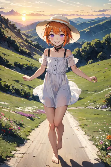Trigger words: short hair, orange hair, purple eyes, blue eyes, long side locks, pilot bodysuit, croptop, midriff, garter belt thighhighs, overalls, frilly shorts