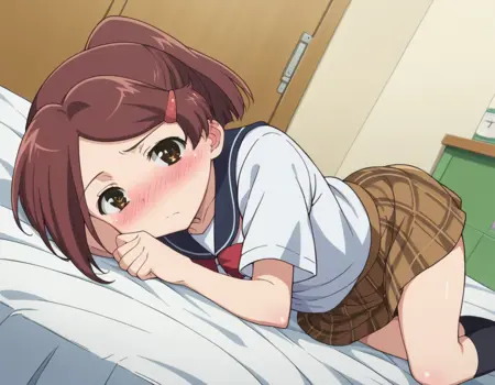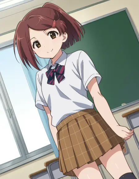ako suminoe, short hair, brown hair, hair ornament, brown eyes, ponytail, hairclip,