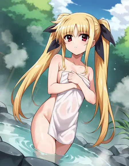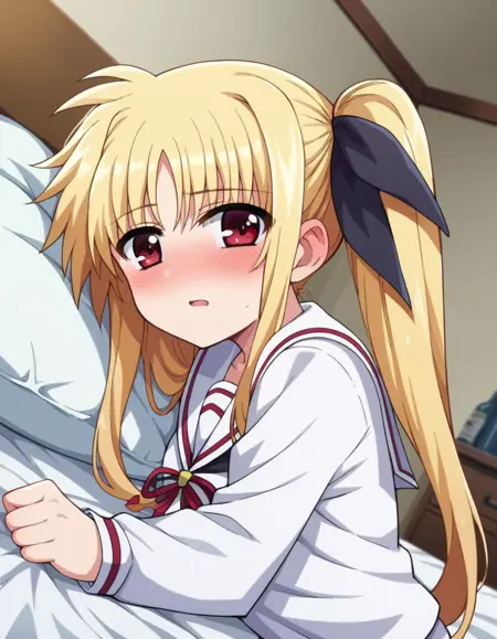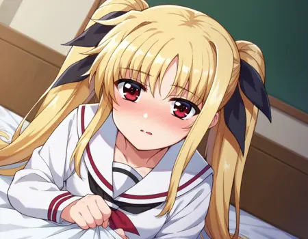 fate testarossa, 긴 머리, 금발, 빨간 눈, 트윈테일, 머리리본,