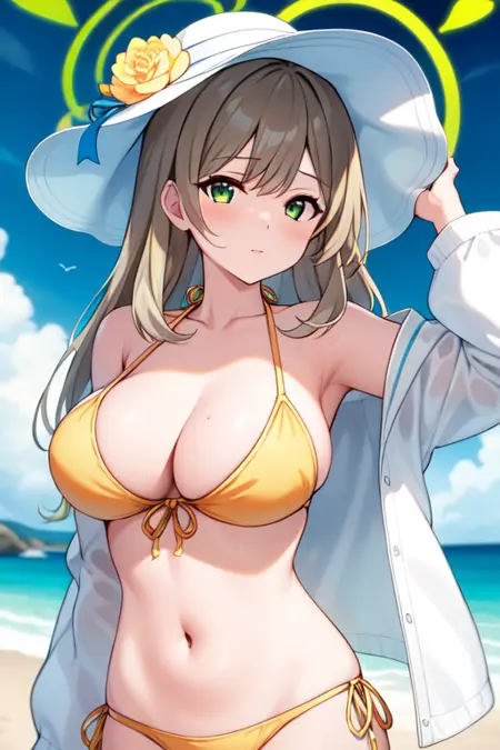 Summer Outfit : nonomisummerBA, long hair, ribbon, navel, bare shoulders,yellow bikini, side-tie bikini bottom, halterneck, white headwear, halo, front-tie top, sun hat, front-tie bikini top, hat flower, white jacket