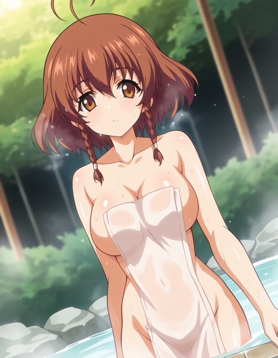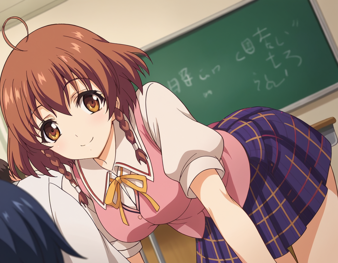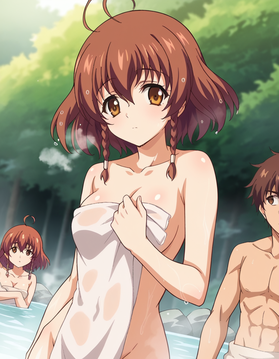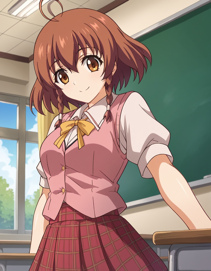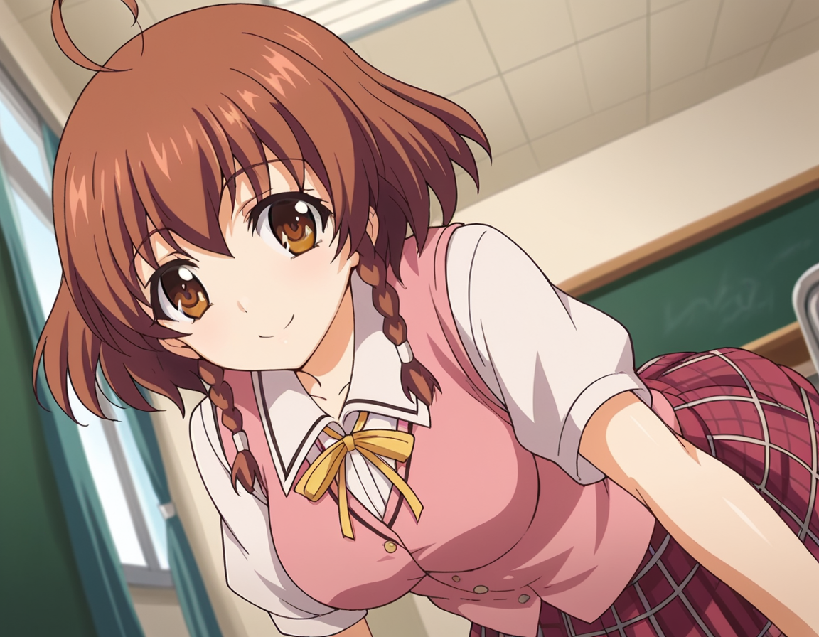 nonoa momose、ショートヘア、茶色の髪、茶色の目、編み髪、アホ毛、ツインバッド、
