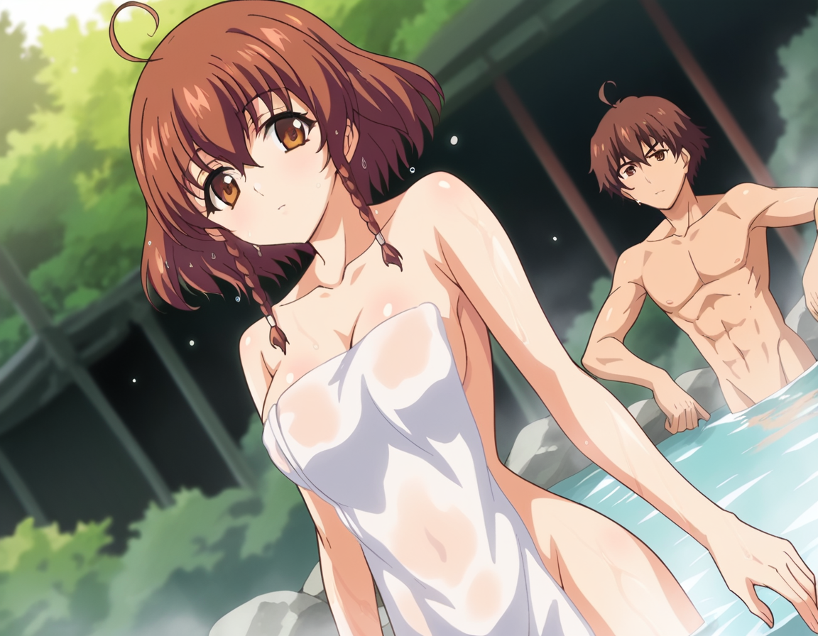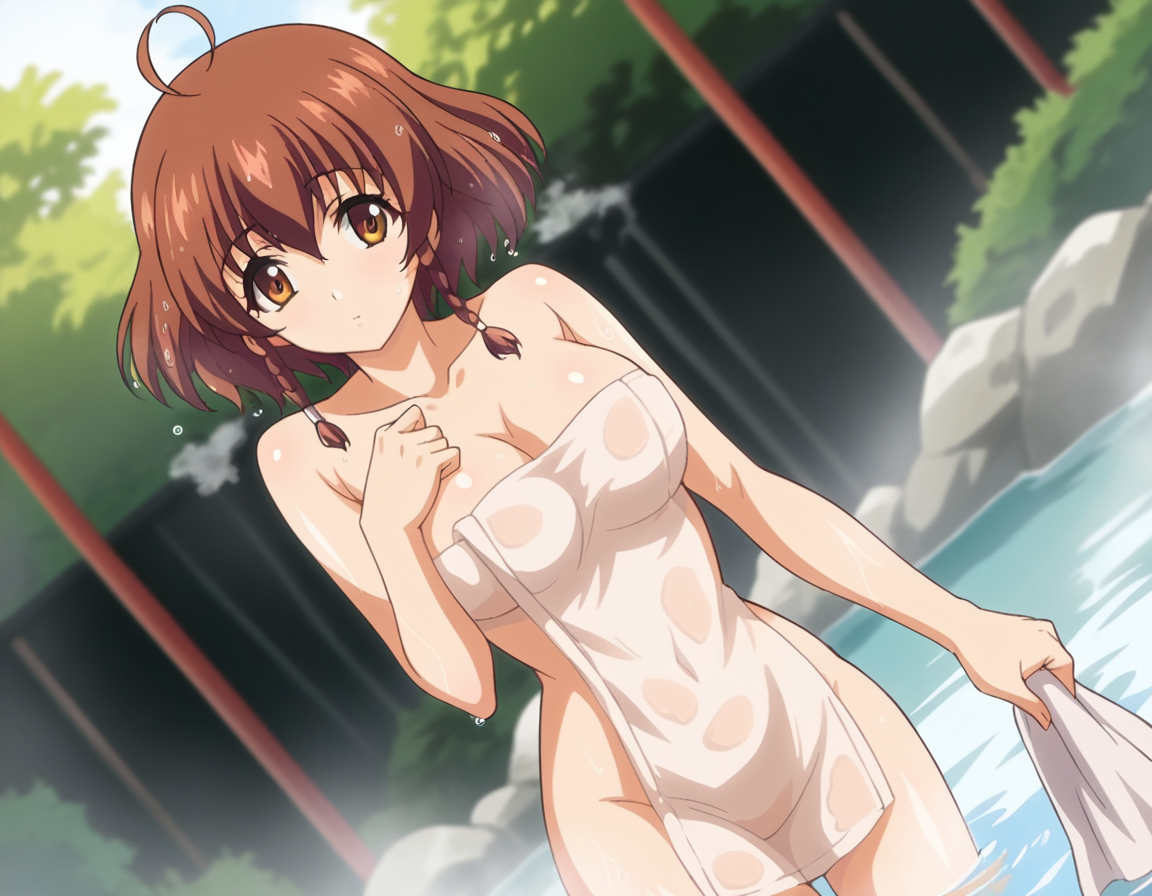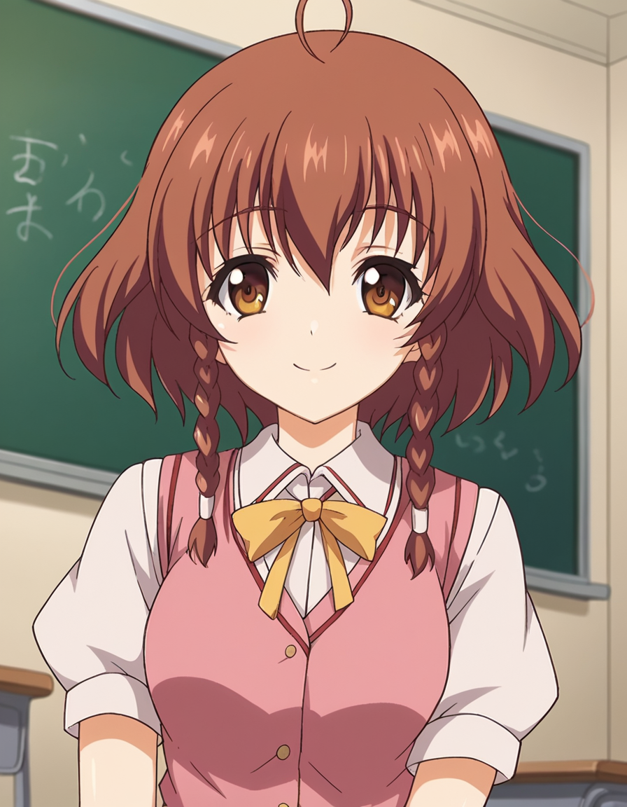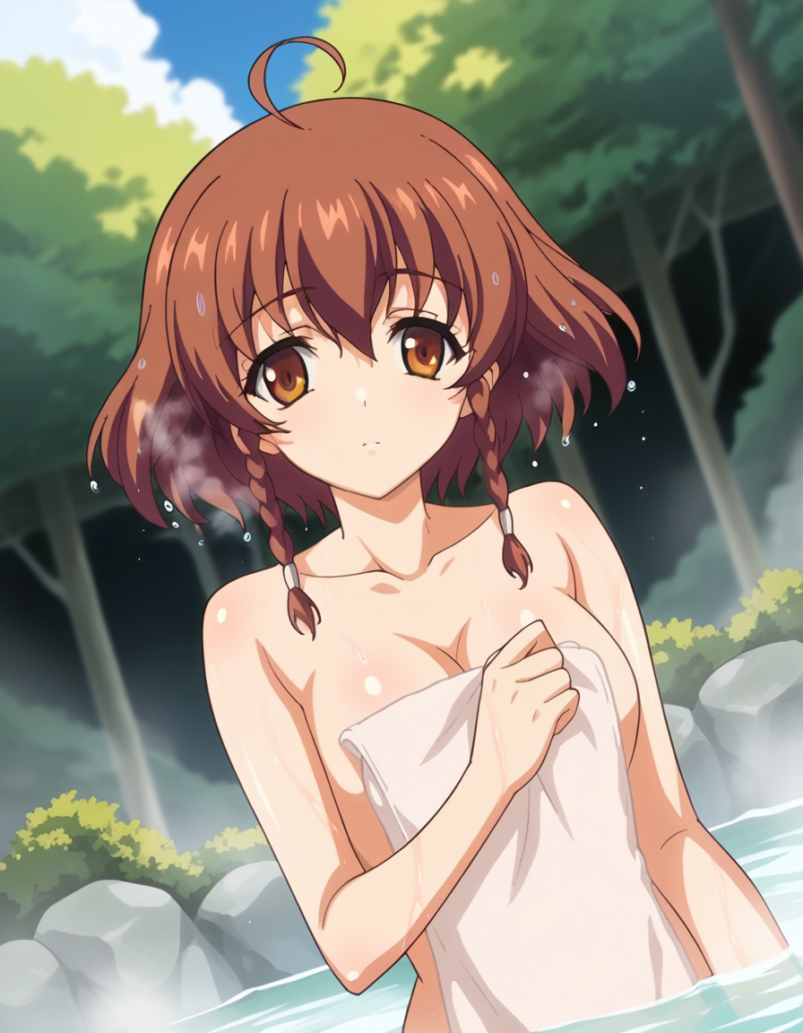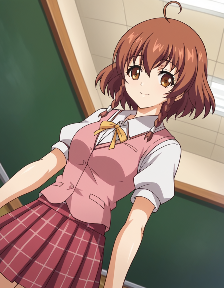 nonoa momose、ショートヘア、茶色の髪、茶色の目、編み髪、アホ毛、ツインバッド、