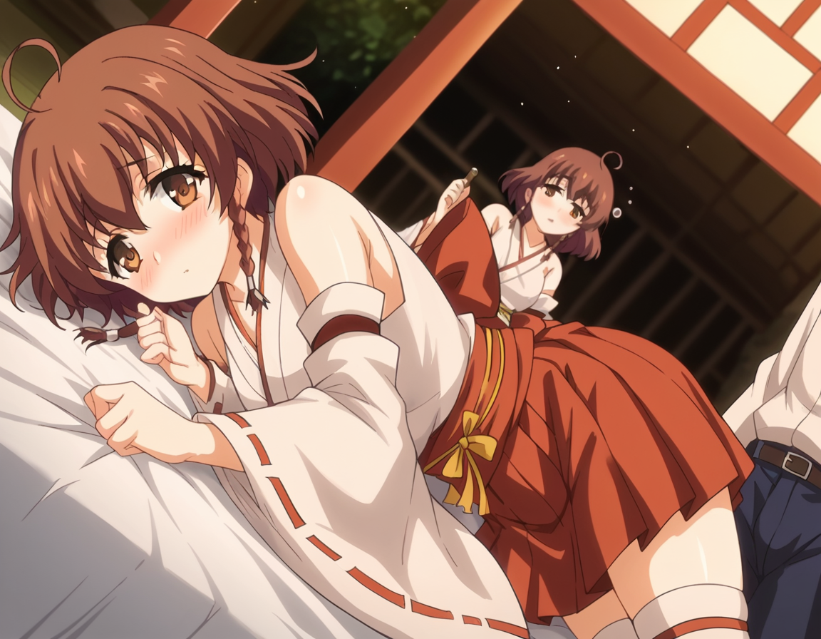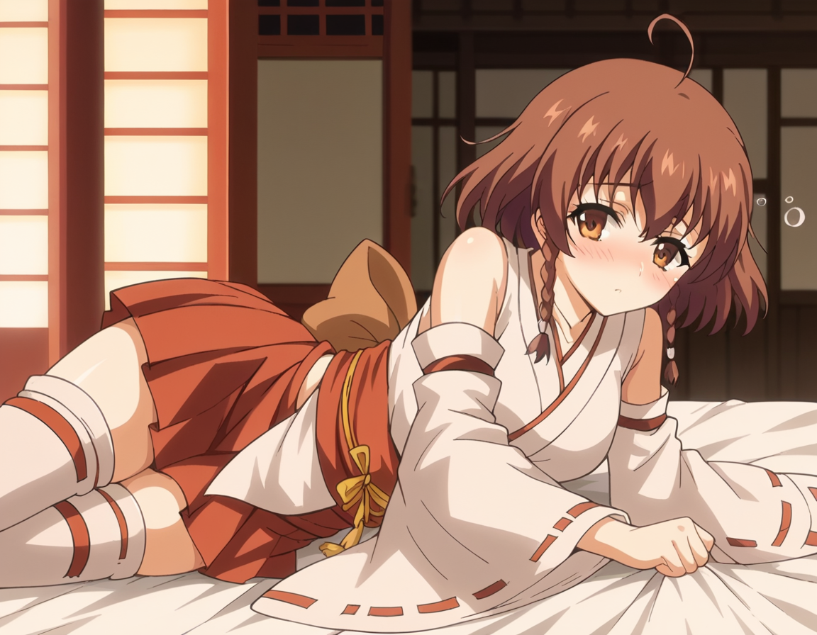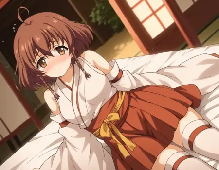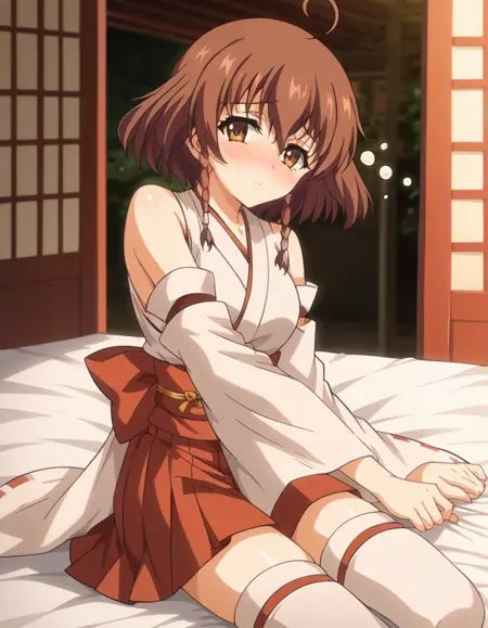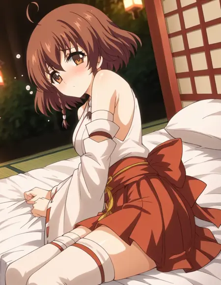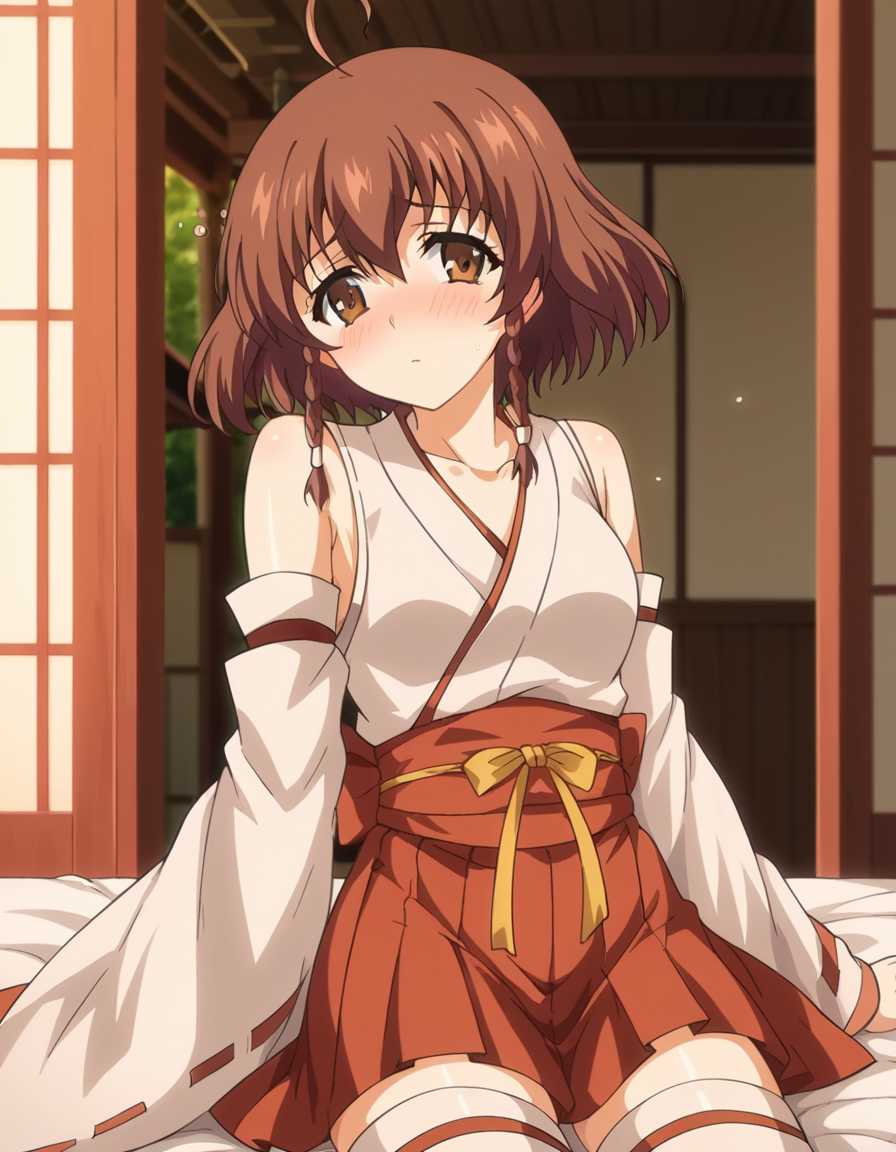スカート、タイツ、リボン、肩出し、プリーツスカート、取り外し可能な袖、日本の衣装、広袖、白いタイツ、絶対領域、赤いスカート、リボン縁取り、非伝統的な巫女、リボン縁取りの袖、巫女、