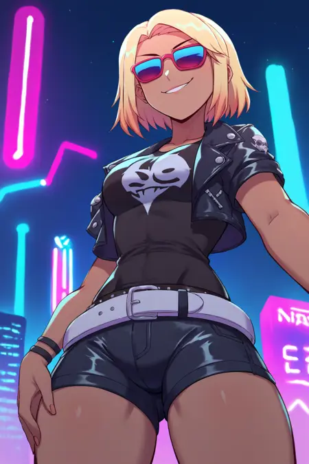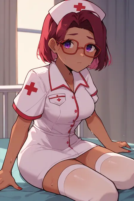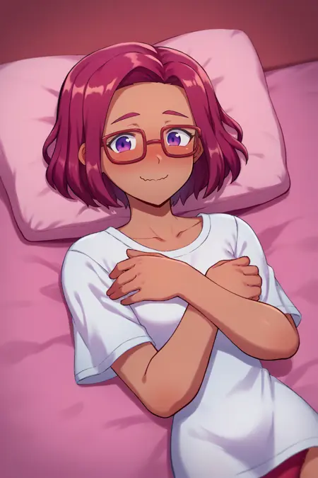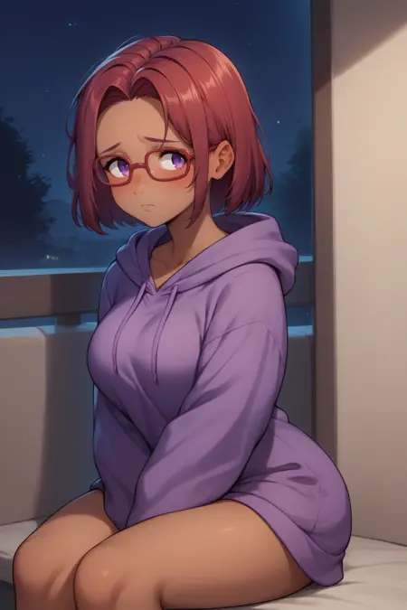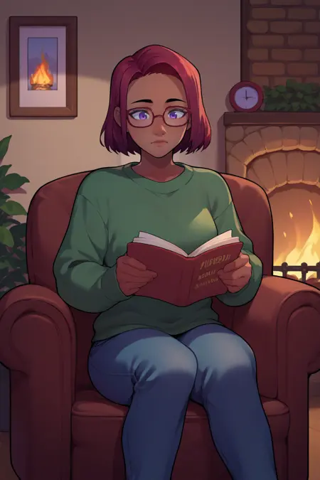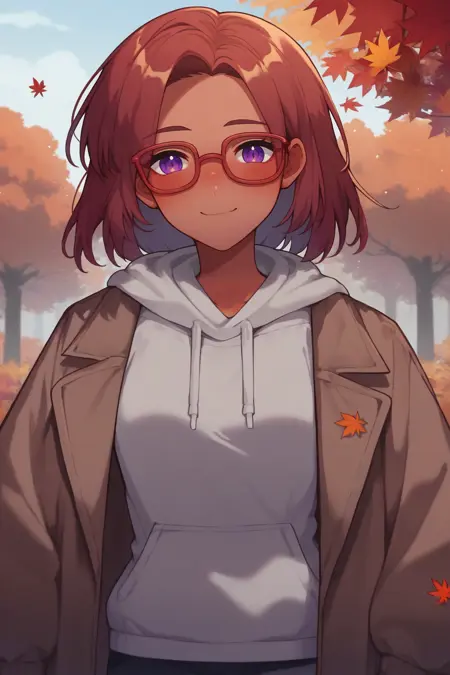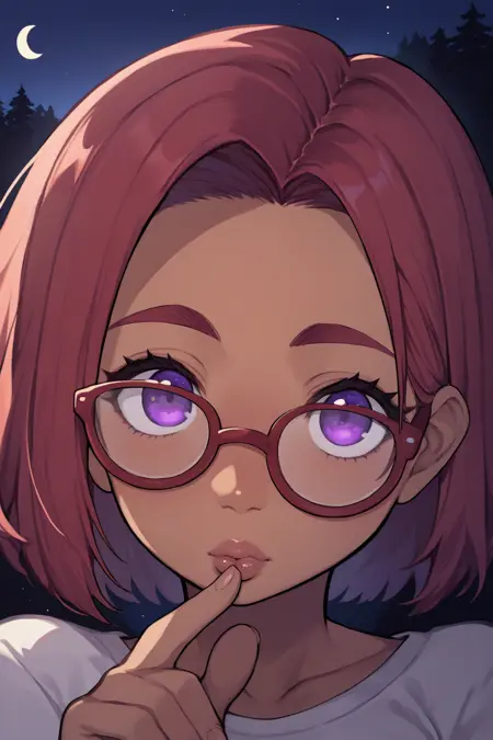 **보조 프롬프트: "**빨간 머리, 검은 피부, 보라색 눈" + "안경" + 모델에 따라 "중간 길이의 머리"