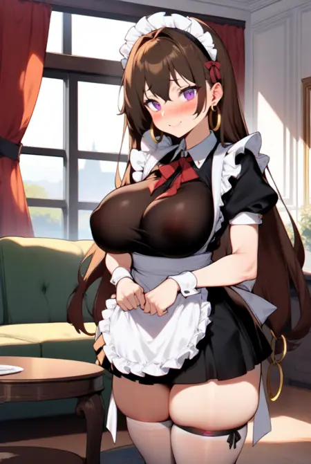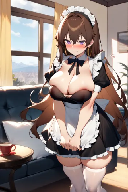 ["xuanzang, purple eyes, brown hair, long hair, purple bikini, bikini top only, bikini under clothes, sleeveless kimono, bridal gauntlets, purple thighhighs, white vest, hoop earrings, bead necklace, red necklace, jewelry, hat"]
