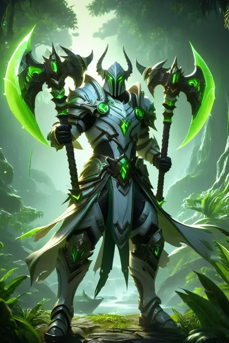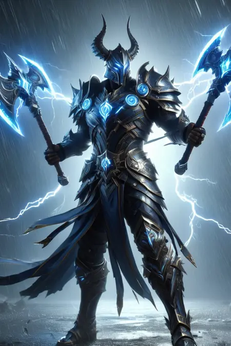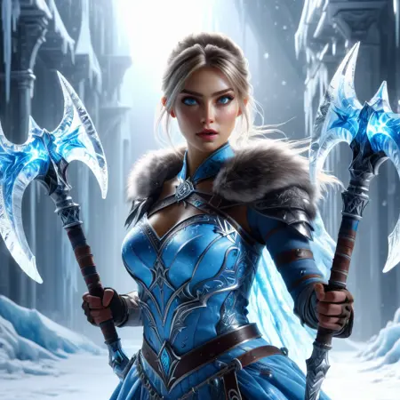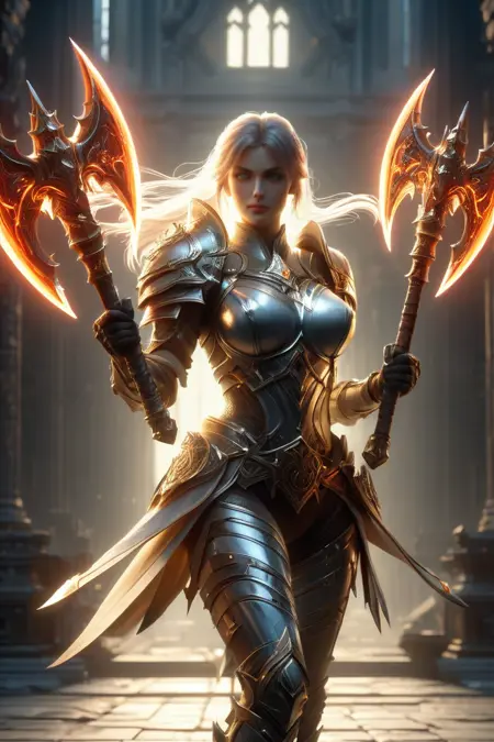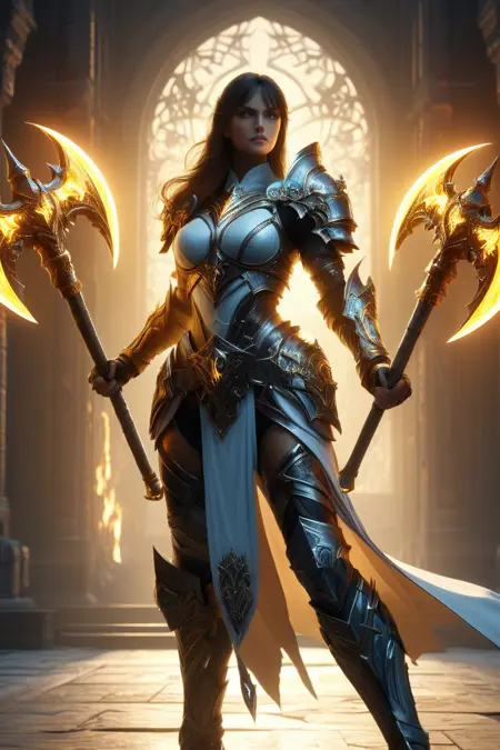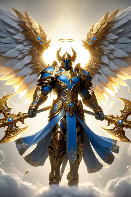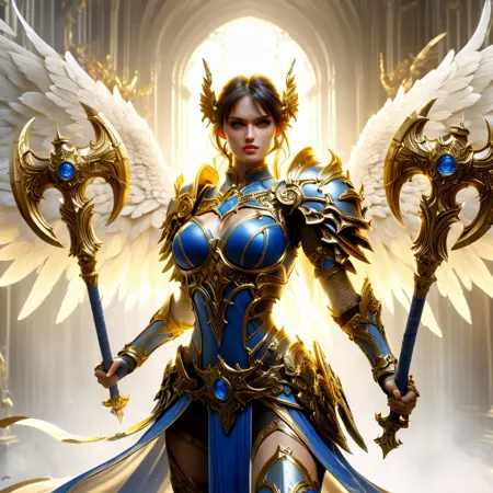 "a cinematic shot of a beautiful female angel character wielding two golden Axes, dual axes, wearing blue and golden armor, wings, heaven in background, reflective light"