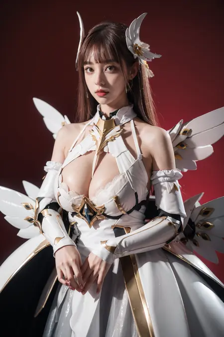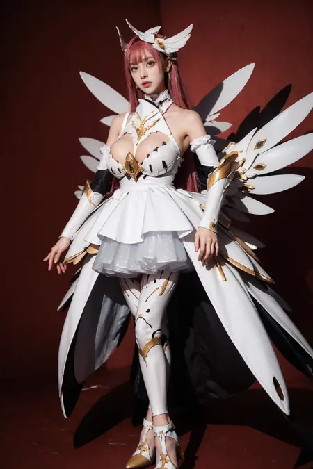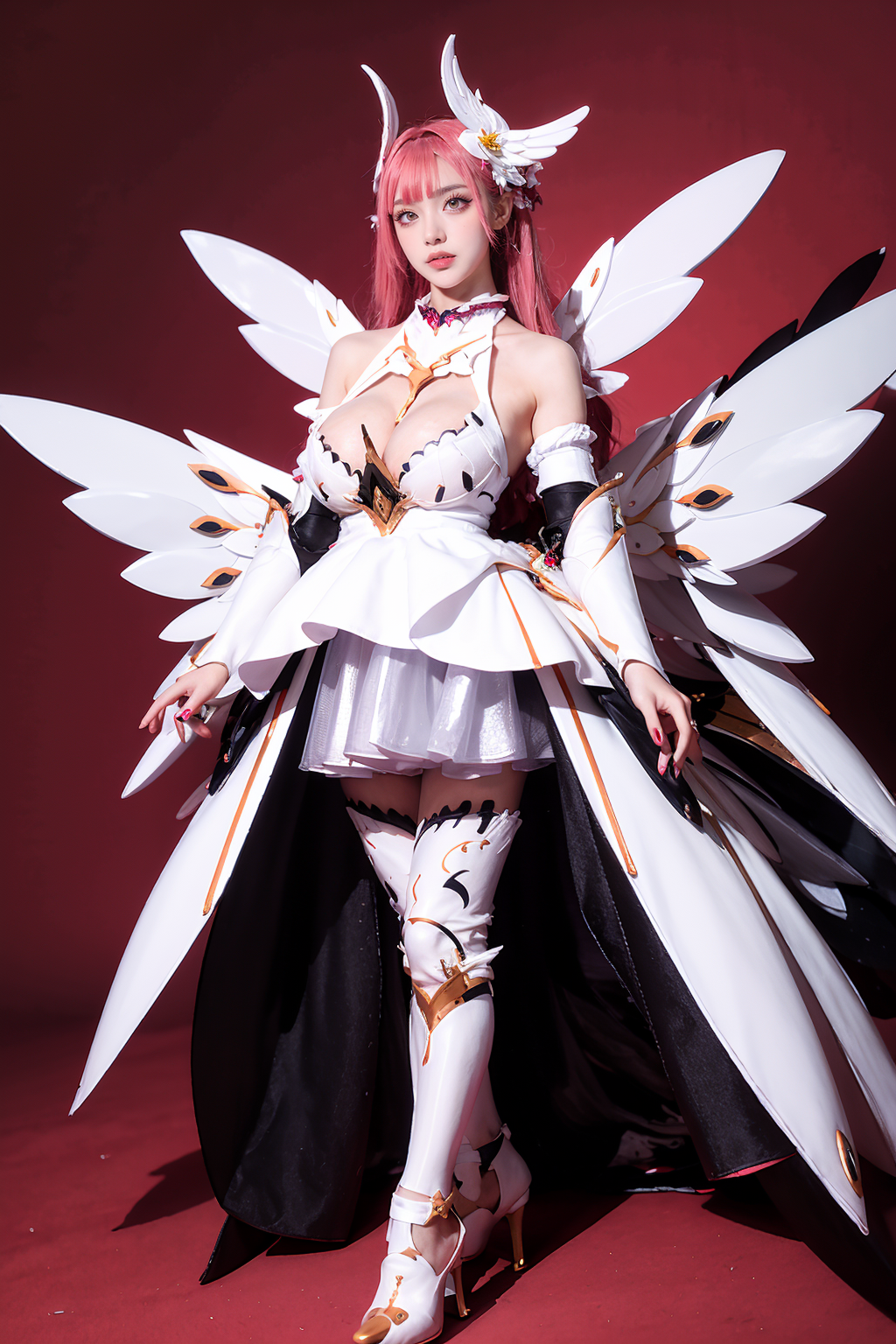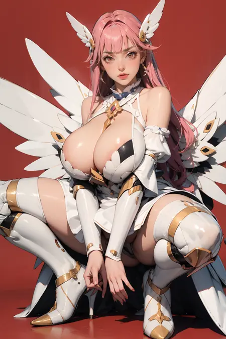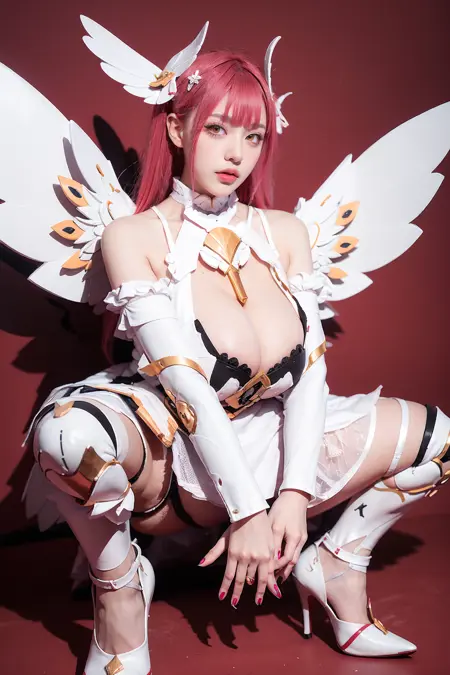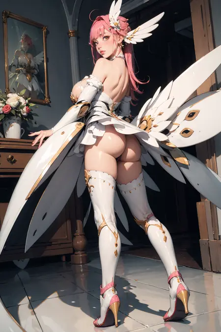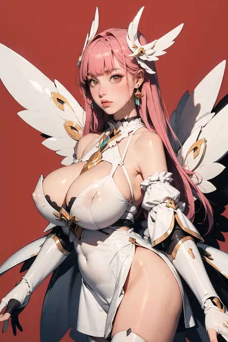 pink hair,bare shoulders,detached sleeves,white dress,mecha,hair ornament,wings,low wings,armor