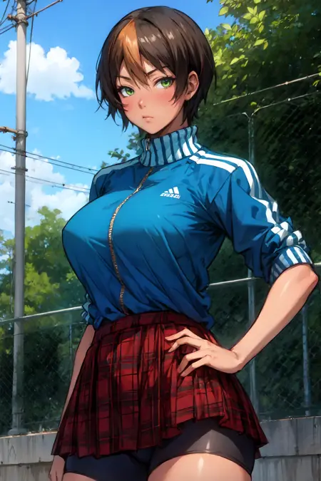 short hair, brown hair, multicolored hair, green eyes, large breasts, tanlines