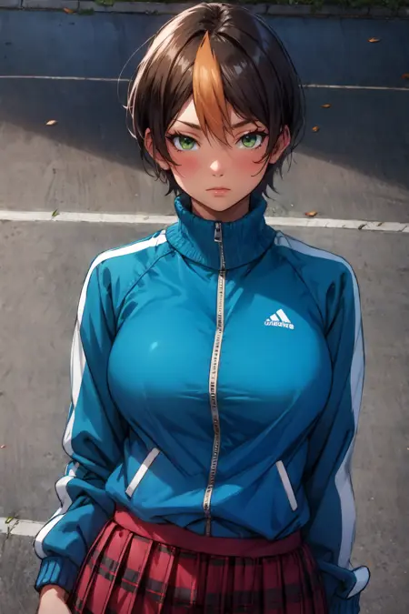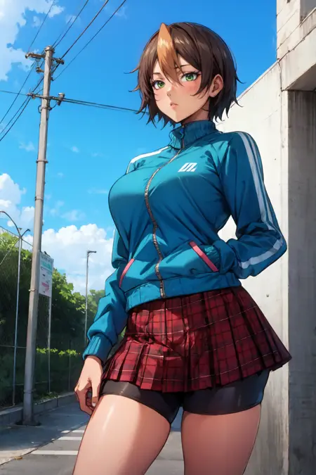 재킷, 트랙 재킷, 치마, 자전거 반바지, 체크 무늬 치마, 양말, 스니커즈