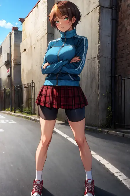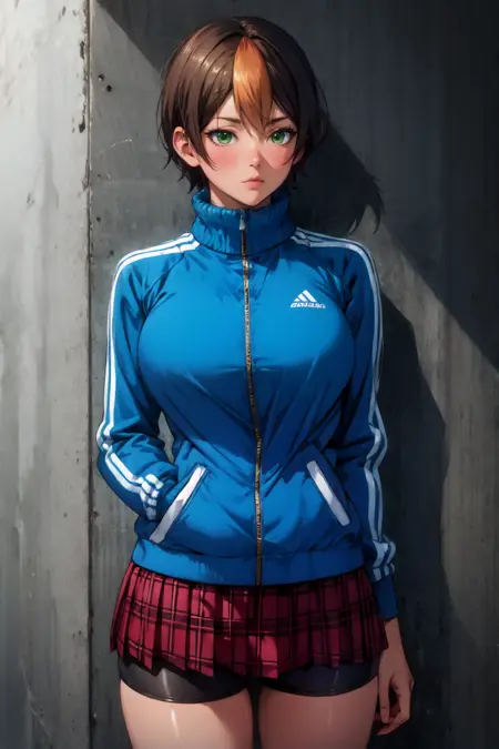 jacket, track jacket, skirt, bike shorts, plaid skirt, socks, sneakers