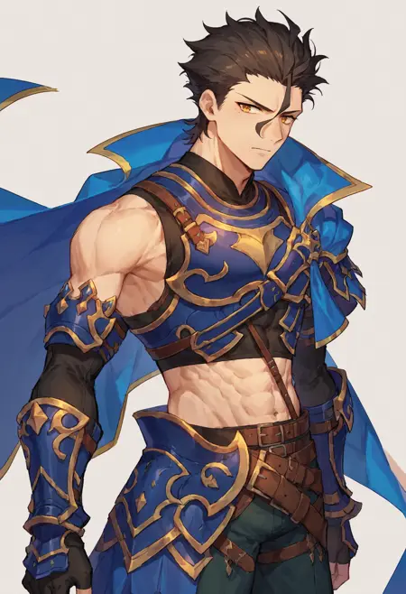 Saber Stage 2触发词集:1boy solo diarmuid saber, blue cape crop top belt pants armor