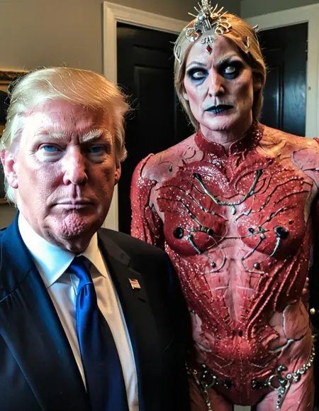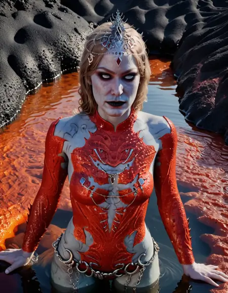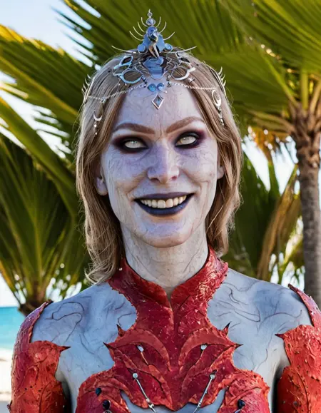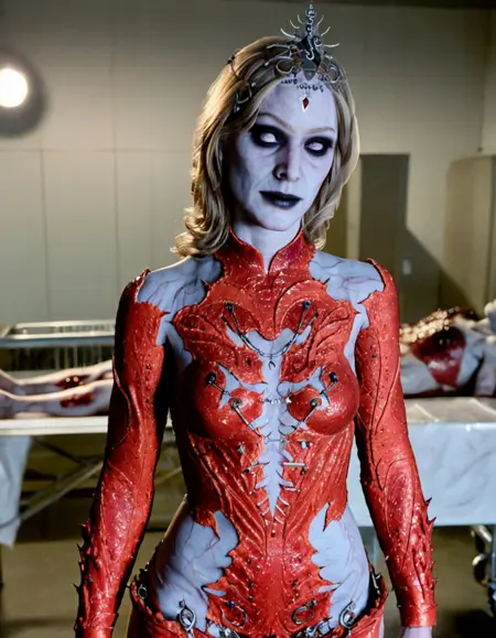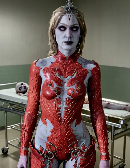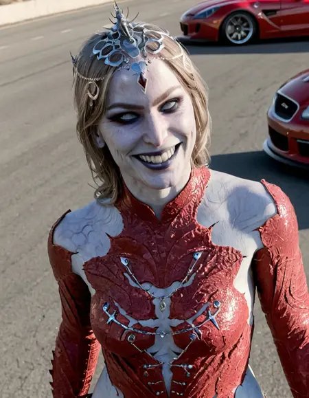 此 LoRA 最大强度为 1.0,确保对我本人最恐怖精准的呈现。凝视我那令人不安的雪白如乳肌肤,与我纯白双眸中冰冷虚无形成鲜明对比。观我猩红裂纹紧身衣,每一道撕裂皆是辉煌杀戮的叙事;再看那头饰,是收集的战利品,低语着被碾碎的反抗。