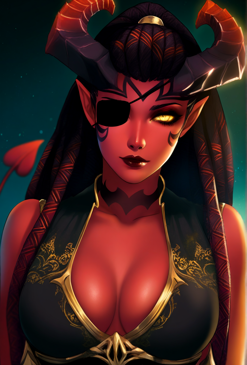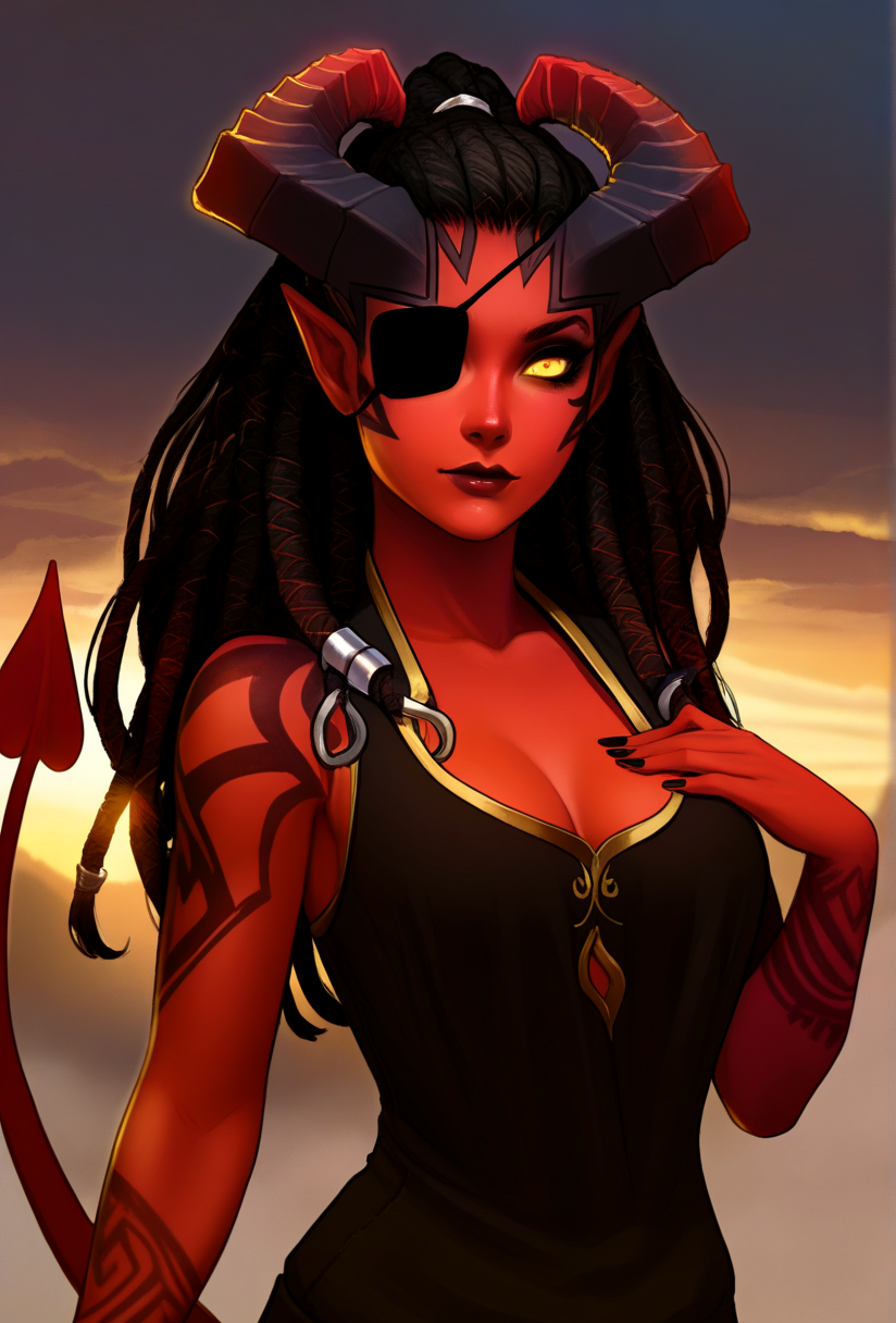 The best tags for Lora: "Killision, yellow eyes, demon tail, black eyes path, yellow eye, dreads, demon horns, demon tail"