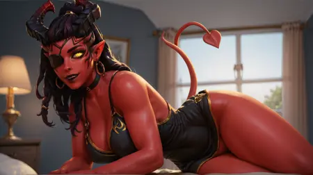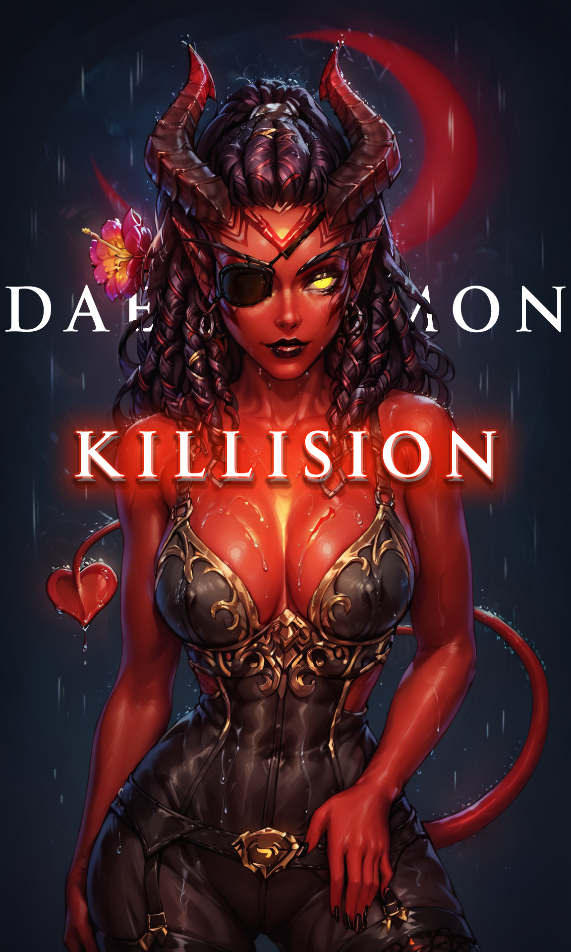 The best tags for Lora: "Killision, yellow eyes, demon tail, black eyes path, yellow eye, dreads, demon horns, demon tail"