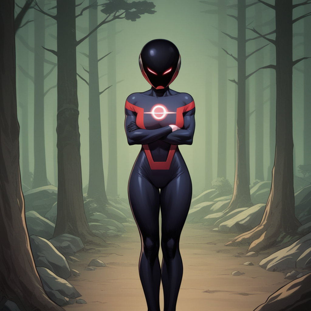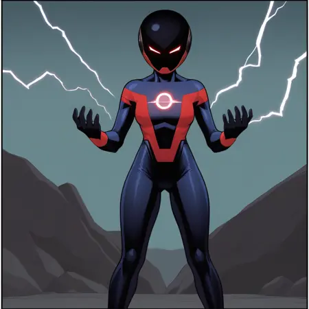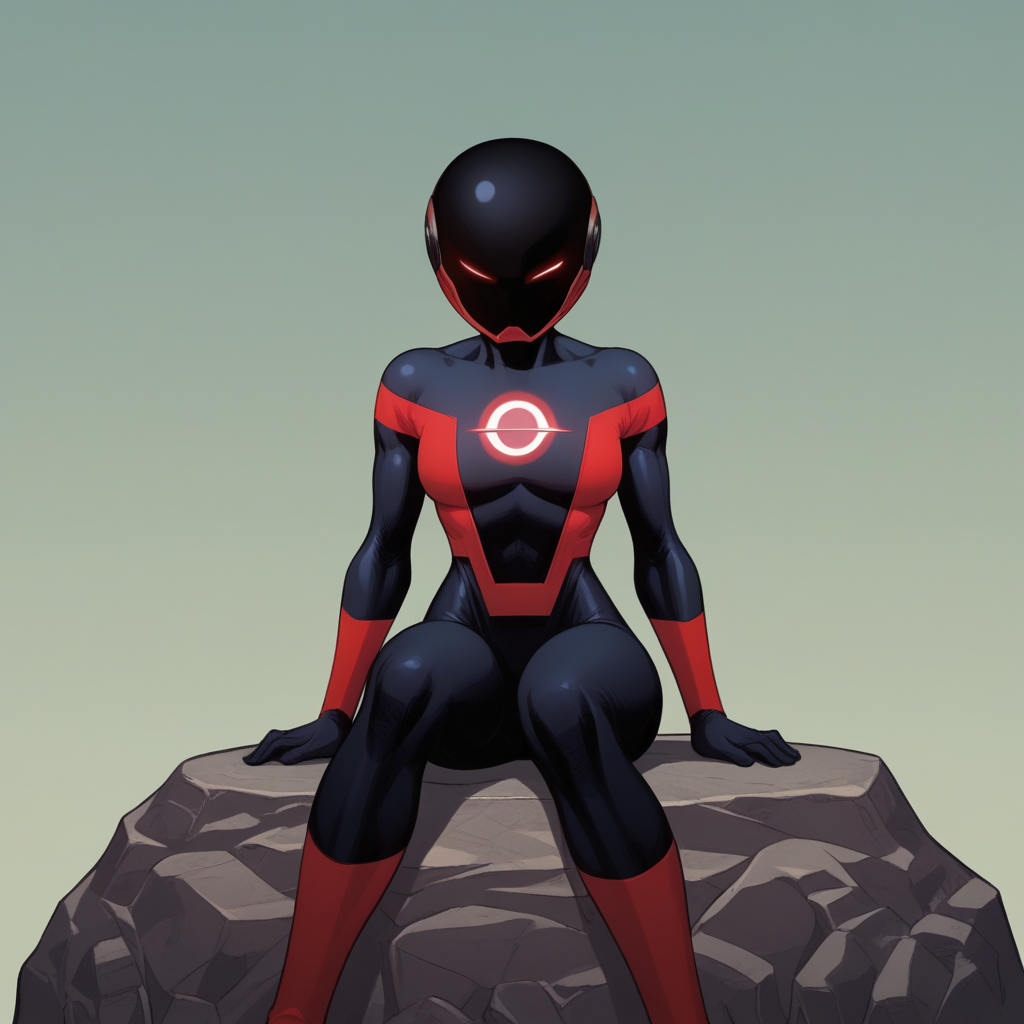 RadiantRed, 1girl, solo, helmet, bodysuit, glowing eyes, superhero,