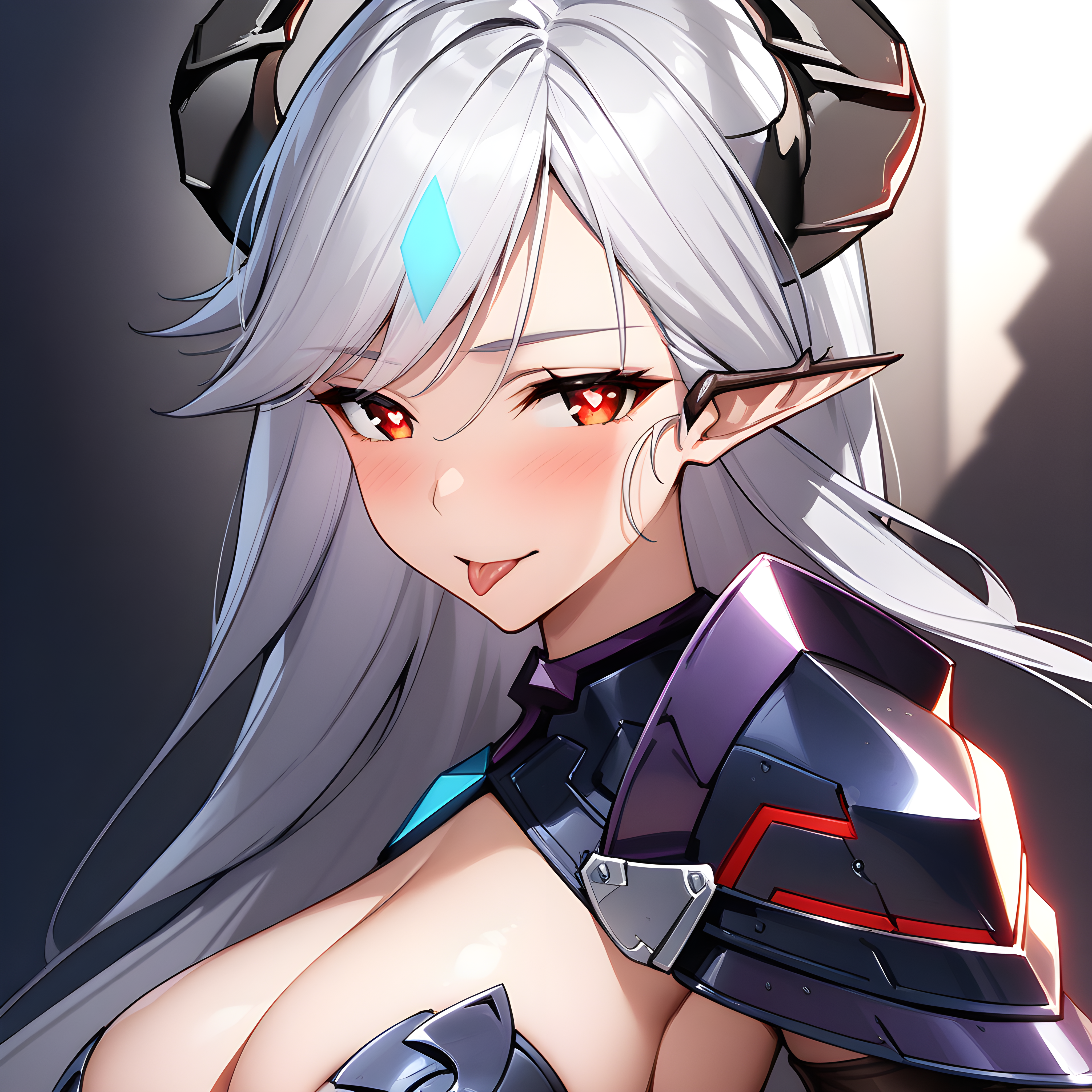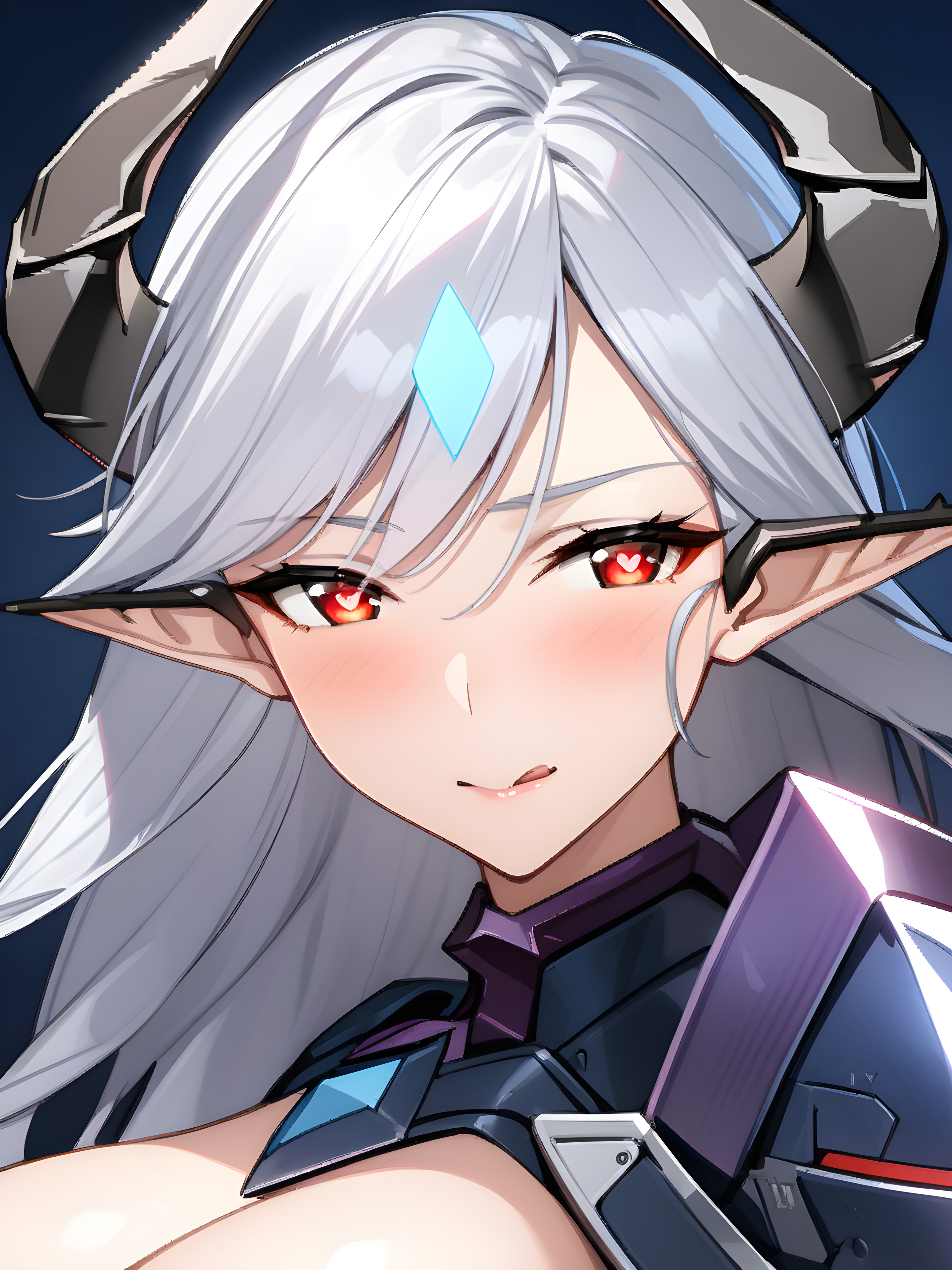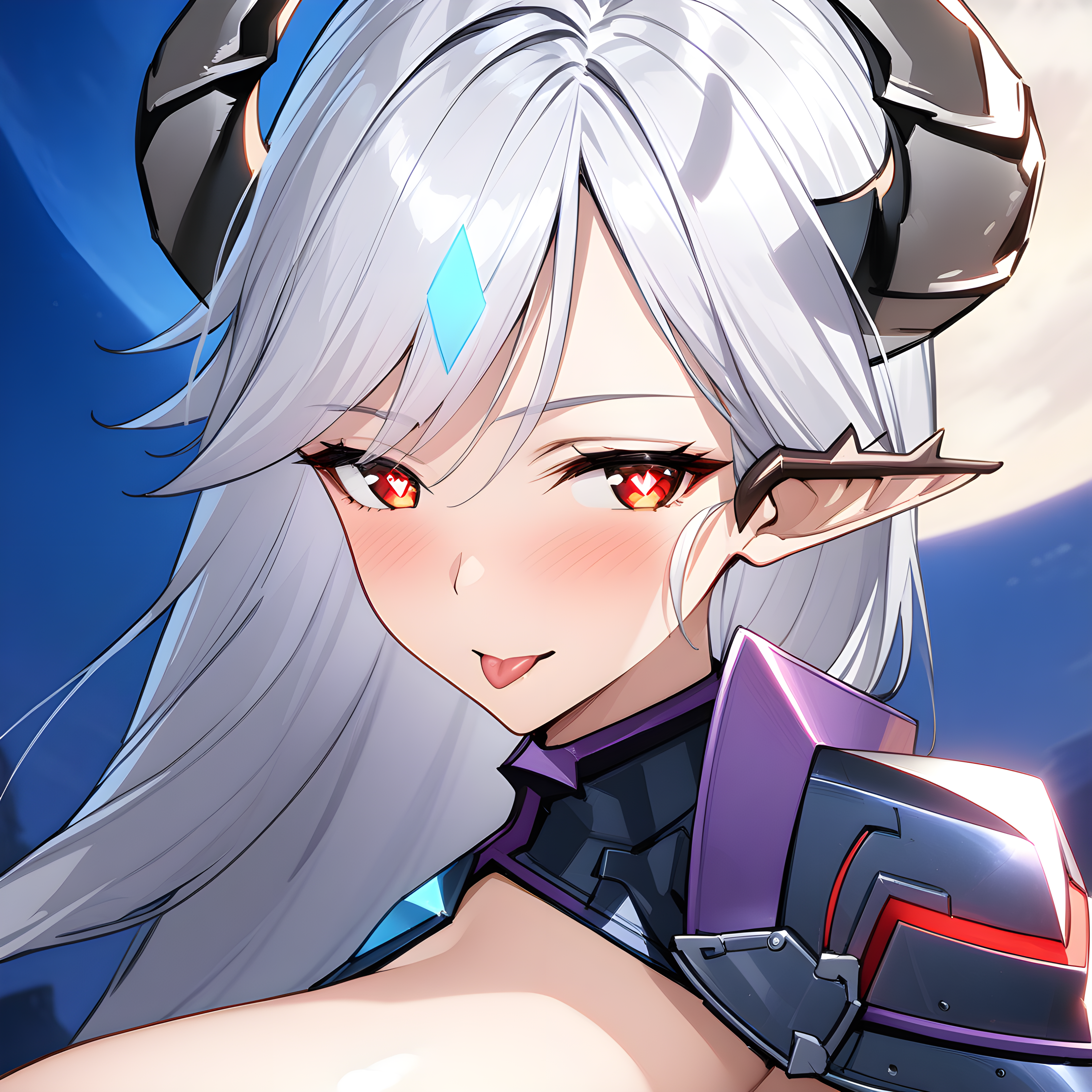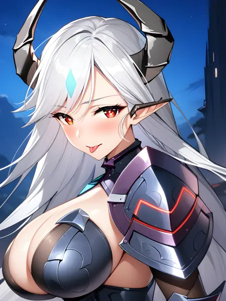 Activate using "e7luna" tag for V2, appearance tag is "horns, pointy ears, long hair, red eyes, large breasts, white hair," and outfit tag is "black breast plate, covered navel, armor, dragon horns, thigh boots, tail, no cape,"