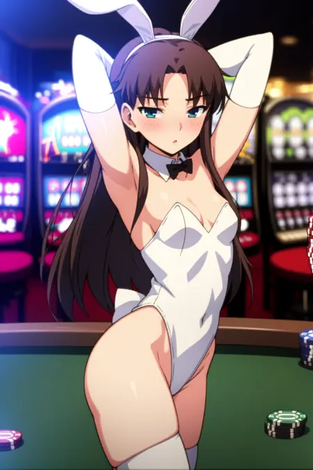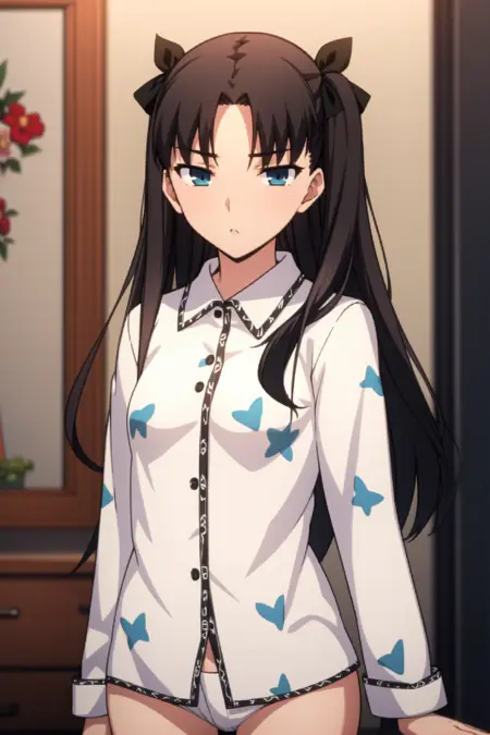 외모: 린, 파란 눈, 갈색 머리, 긴 머리, 양쪽 올려매기, 갈라진 앞머리, 검은 머리 리본