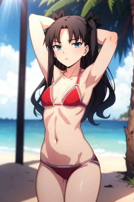 옷차림: 빨간 스웨터, 긴 소매, 터틀넥, 십자 무늬, 검은 치마, 주름치마, 미니스커트, 검은 히가이 스타킹