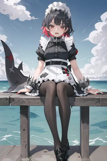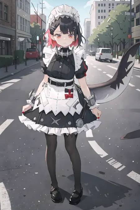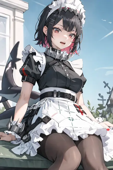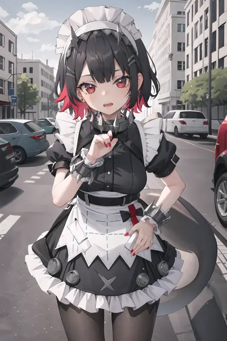 기본 게임 메이드 복장에 추가할 프롬프트: hairclip, argyle pantyhose, red nails, black footwear, maid headdress, maid apron, wrist cuffs, maid dress, spiked collar