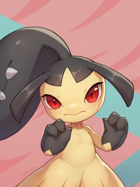 Mawile 标签: mawile, 马尾, 长侧发, 黄色皮肤, 黑色头发, 齐刘海, 宝可梦 \(生物\), 红色眼睛, 额外嘴巴