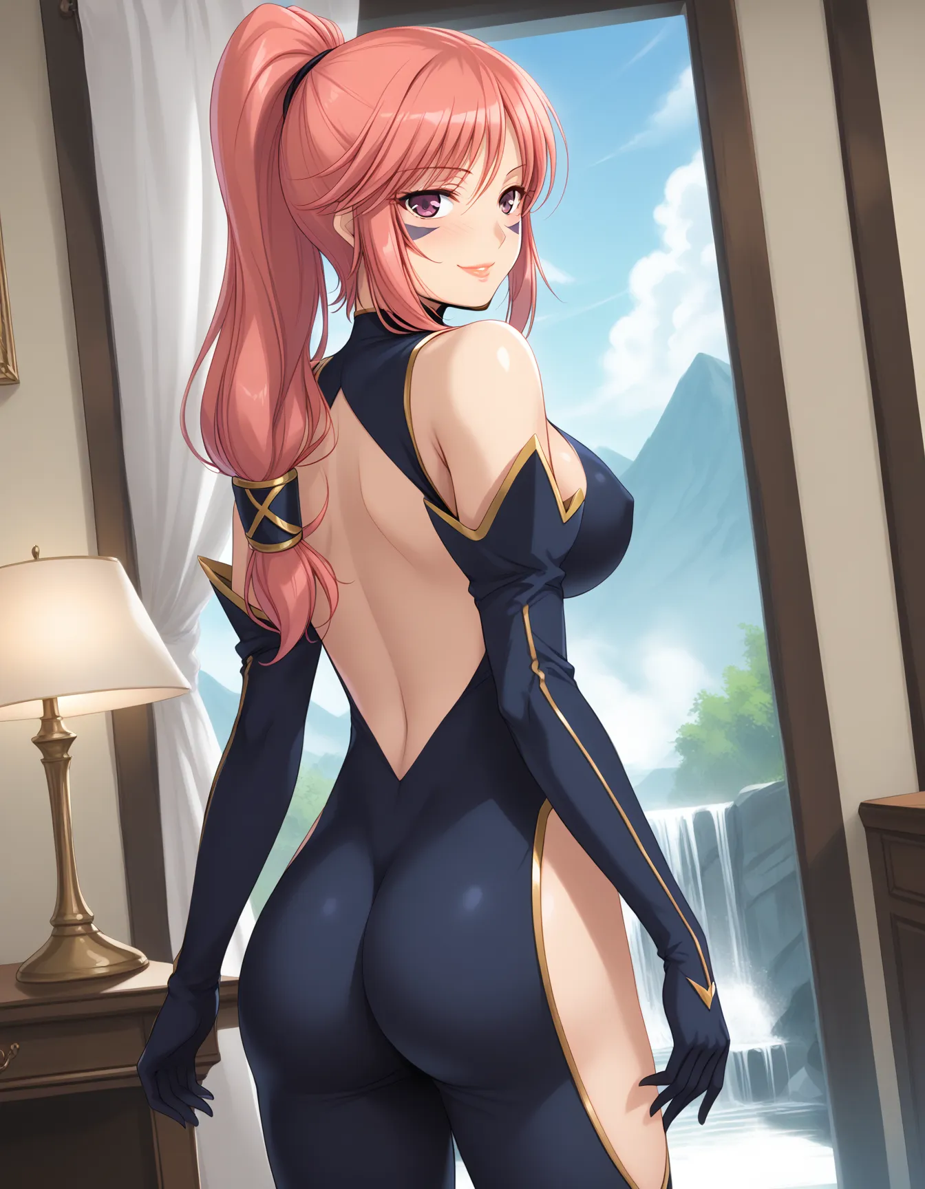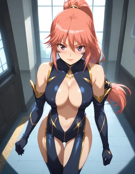 권장 프롬프트(의상): black bodysuit, center opening,clothing cutout,elbow gloves, hip vent, thigh cutout,