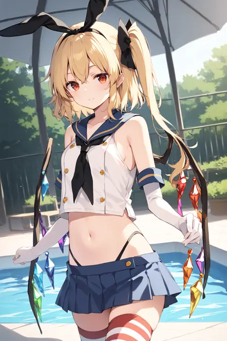 推奨:flanN, flandre scarlet, blonde hair, side ponytail, red eyes, hair bow, red bow, hair between eyes, slit pupils, white headwear,wings, crystal, crystal wings,