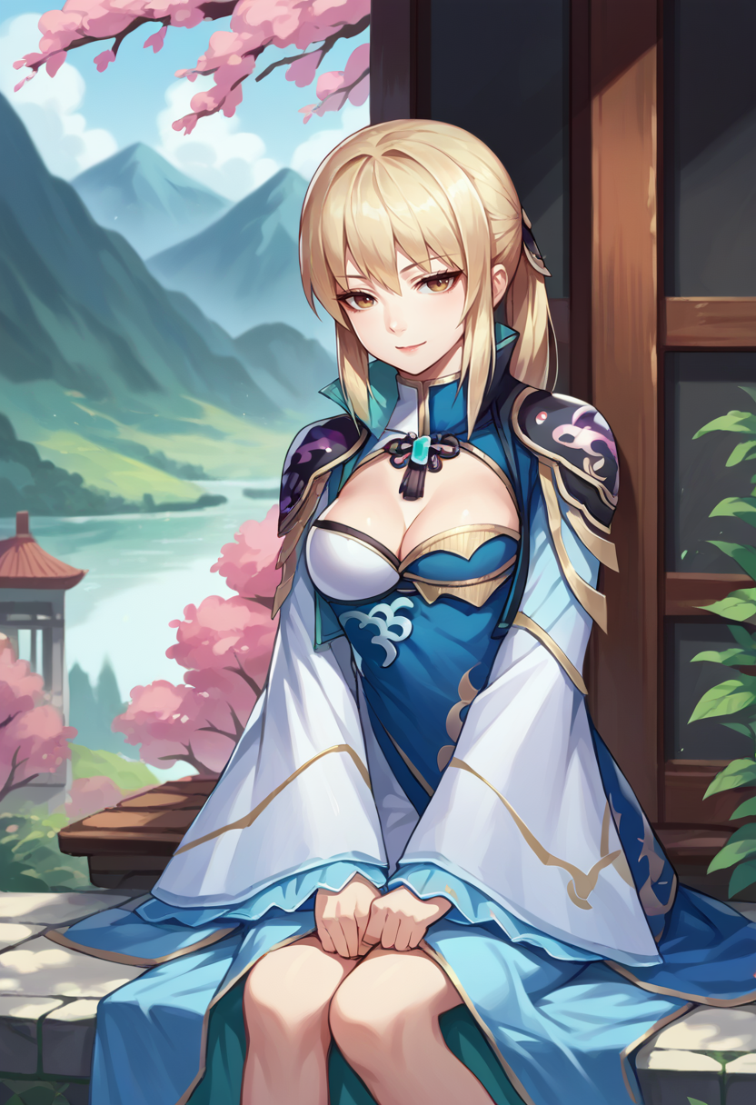 Default Outfit: blue dress, cleavage cutout, shoulder armor, long sleeves, wide sleeves