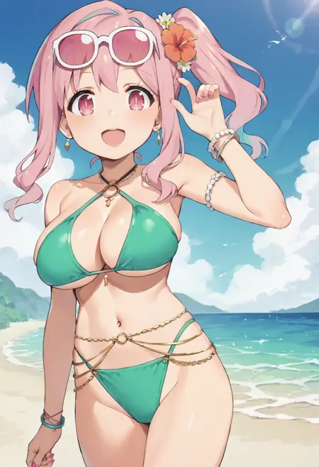 kaede-swim,hozuki kaede,pink eyes,pink hair,side ponytail,hair flower,swimsuit, bikini,eyewear on head, belly chain,