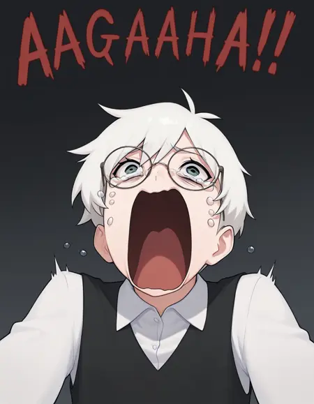 プロンプト: Anton_Petrov, solo, green eyes, white hair, long sleeves, white shirt, black vest, glasses, black shirt.