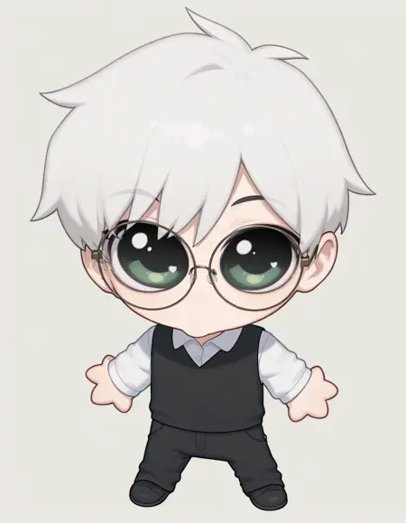 プロンプト: Anton_Petrov, green eyes, white hair, long sleeves, white shirt, black vest, glasses, black shirt, black pants, male.